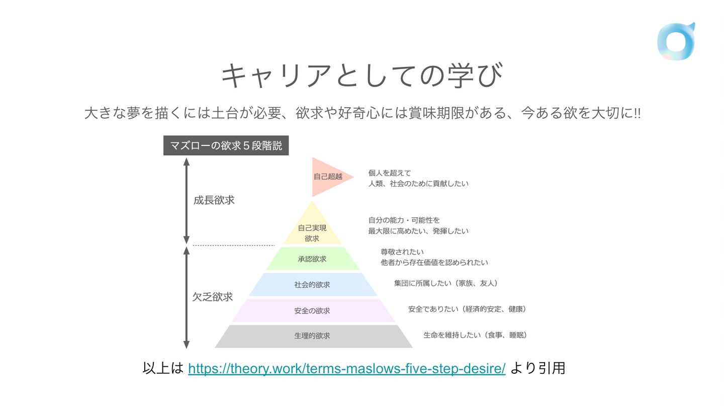 以上の画像はこちらのメディアより引用させていただきました。キャリアの学びとして、夢を描くことは本当に大切、でも初めから大きくて立派な夢を描くことなんて難しくて、土台の部分からしっかり固めて自分を肯定していく中で、初めて上流にある自己実現欲求や「人類や社会をもっと良くしたい」という自己超越欲求が湧いてくることを実感しています。