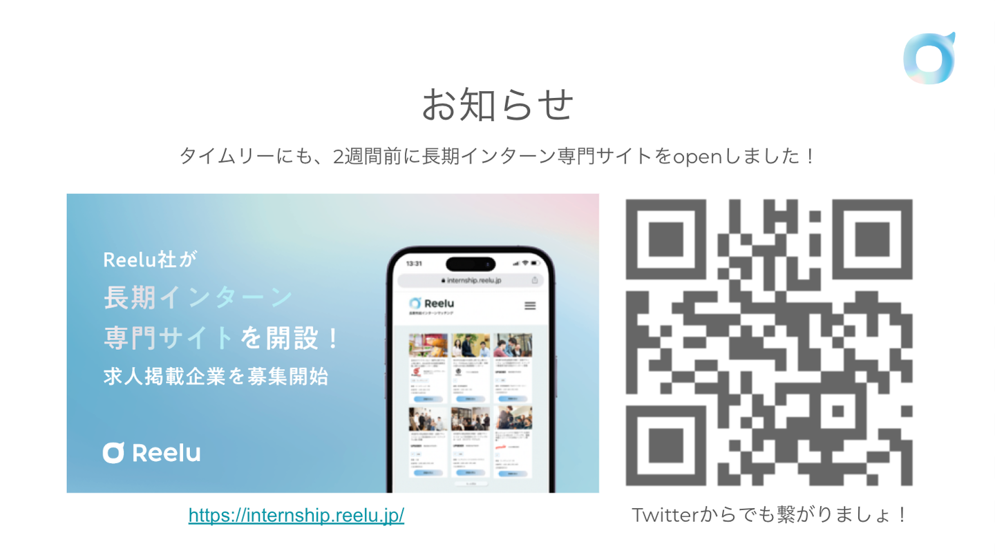 そういえばつい2週間ほど前に、長期インターンシップの専門サイトを学生向けに公開しました!私は大学4年生で初めてインターン(たるもの)を経験したけど、1.2年次に経験できていたならば、職業観がもっと早く形成されたのに・・と思ってて、そんな機会広げたいなと思い、着想から2週間くらいで社内のメンバーが爆速で開発しました。1年生から、そして海外留学中の方まで、何らか機会が転がっていると思うので、ぜひのぞいてみてください。