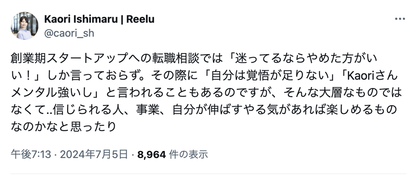 お金でも安定でもない、何よりも”機会”を渇望していた私にとって、初めてのスタートアップはめちゃめちゃ心地が良くワクワクする場所でした。ここでは年次も年齢も、役割でさえも関係ない。皆が事業成長を心から願い、全力でコミットしている。