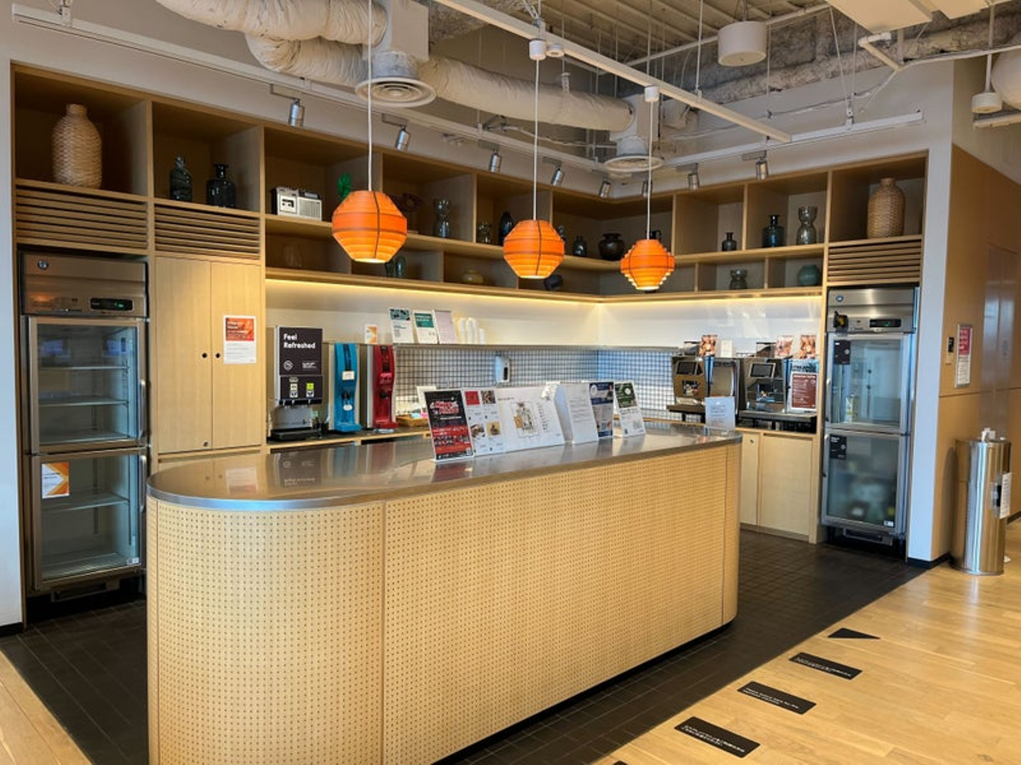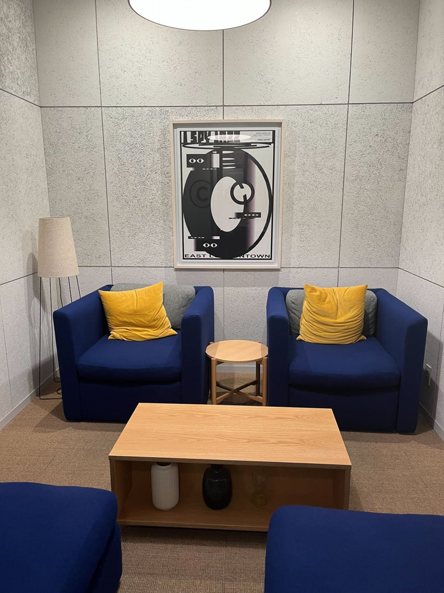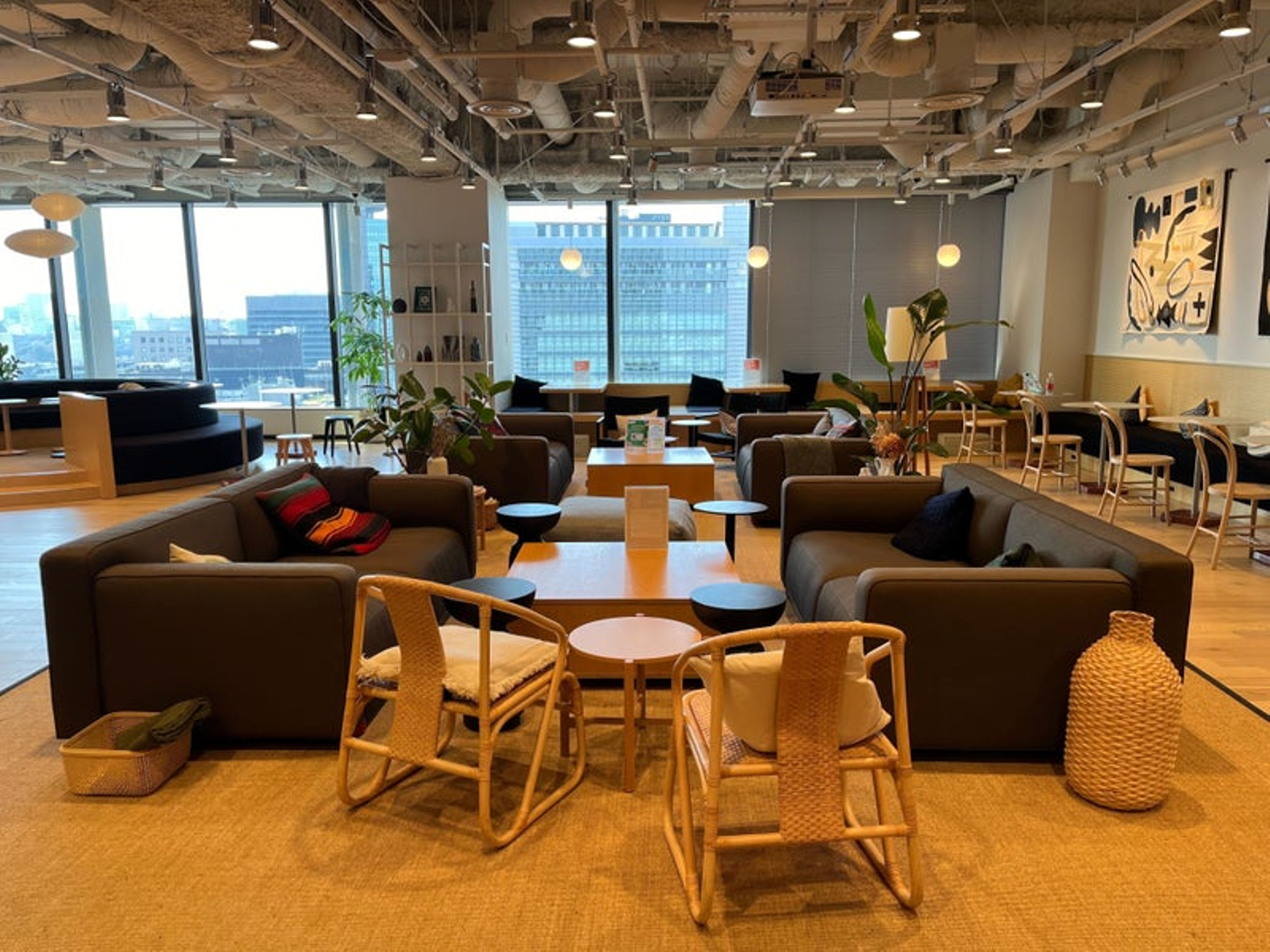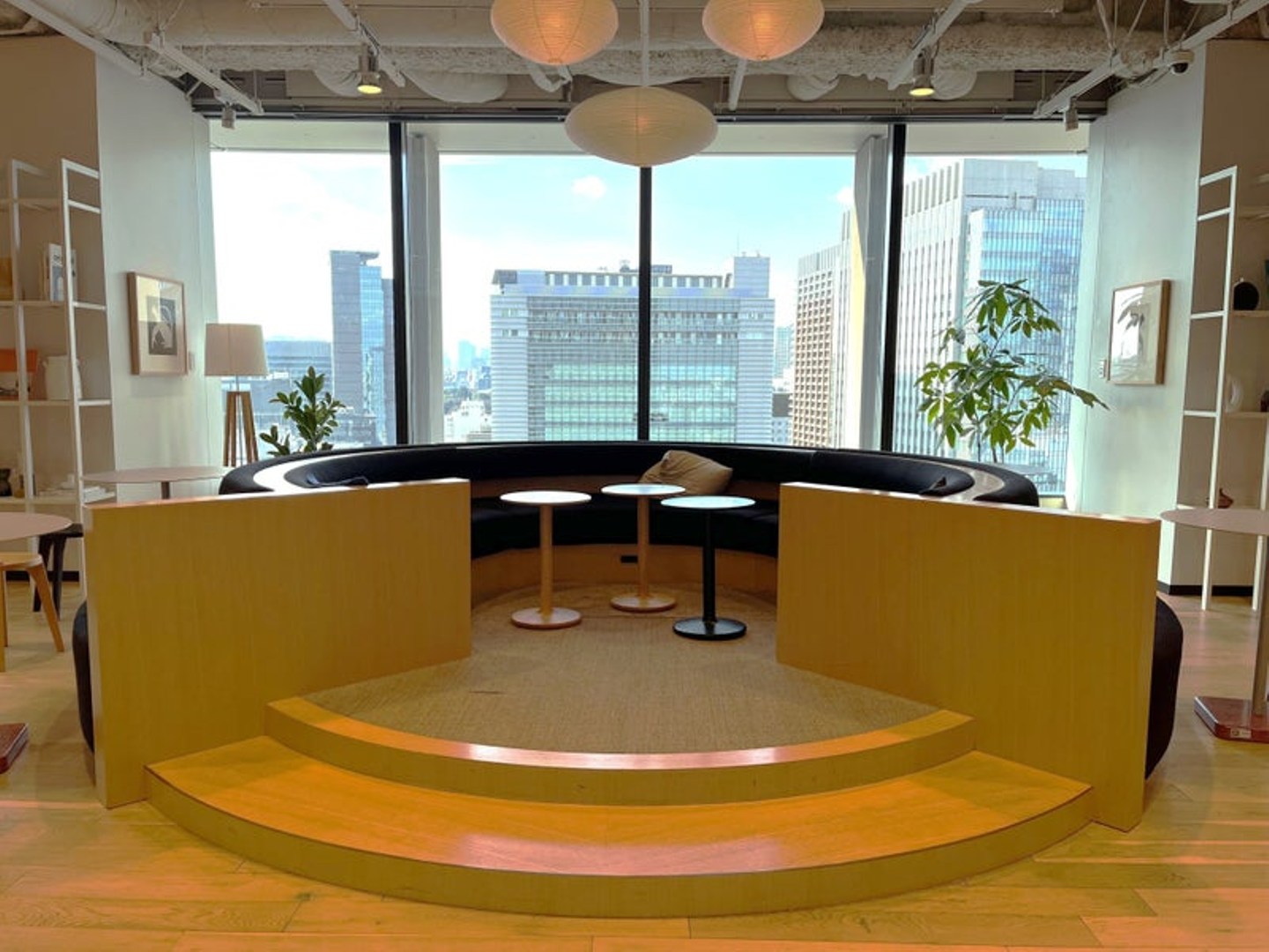 開けたスぺースなので、カジュアルな打ち合わせや、休憩などによく利用しております!普段は様々な方達がここで仕事をしております!!