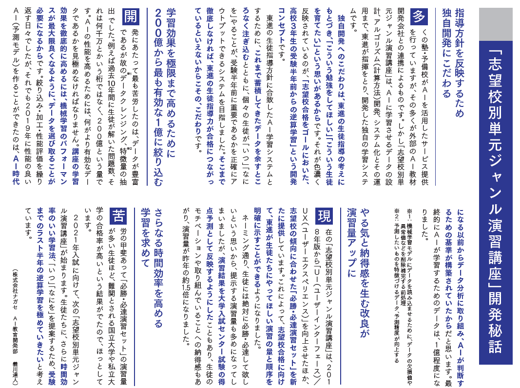 株式会社ナガセフォローhttps://www.toshin.com/nagase/new東京都フォローホーム私たちについてメンバーストーリー募集 東進×AI!志望校別単元ジャンル演習講座 山本 葵 その他 on 2020/07/08 東進では、最後まで学力を伸ばして合格可能性を高めるために、入試直前期の演習まで徹底的に行います。そのうちの一つが、この「志望校別単元ジャンル演習講座」です。この講座の大きな特長は、最新のAIによる学力診断で、君の志望校合格に必要な取り組むべき単元・ジャンルと問題レベルが明確にわかること、そして診断結果をもとに条件づけをすると、10万問以上のデータベースから最適な問題が提案されて演習できることです。現役合格No.1の東進が保有するビッグデータを投入し最新のAIを活用した、一人ひとりに最適な志望校対策を実現する日本初の学習システムです。◇志望校別単元ジャンル演習の紹介はコチラ◇開発秘話はコチラ◇利用者の声はコチラ 株式会社ナガセでは一緒に働く仲間を募集しています 東進×AI!志望校別単元ジャンル演習講座 山本 葵 株式会社ナガセ / その他 AI 開発 開発秘話 ビッグデータ 教育✕IT 1 いいね! シェア 1 いいね!