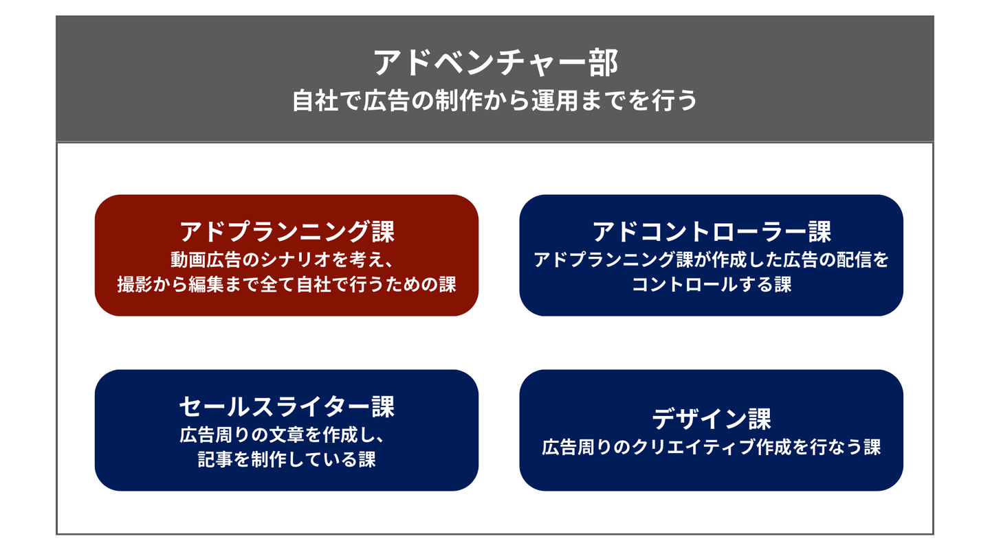 ファンネルアドは事業開発会社ですが、立ち上げた事業をグロースさせるためにインハウスマーケティング部隊を設置しており、こちらがアドベンチャー部になります。