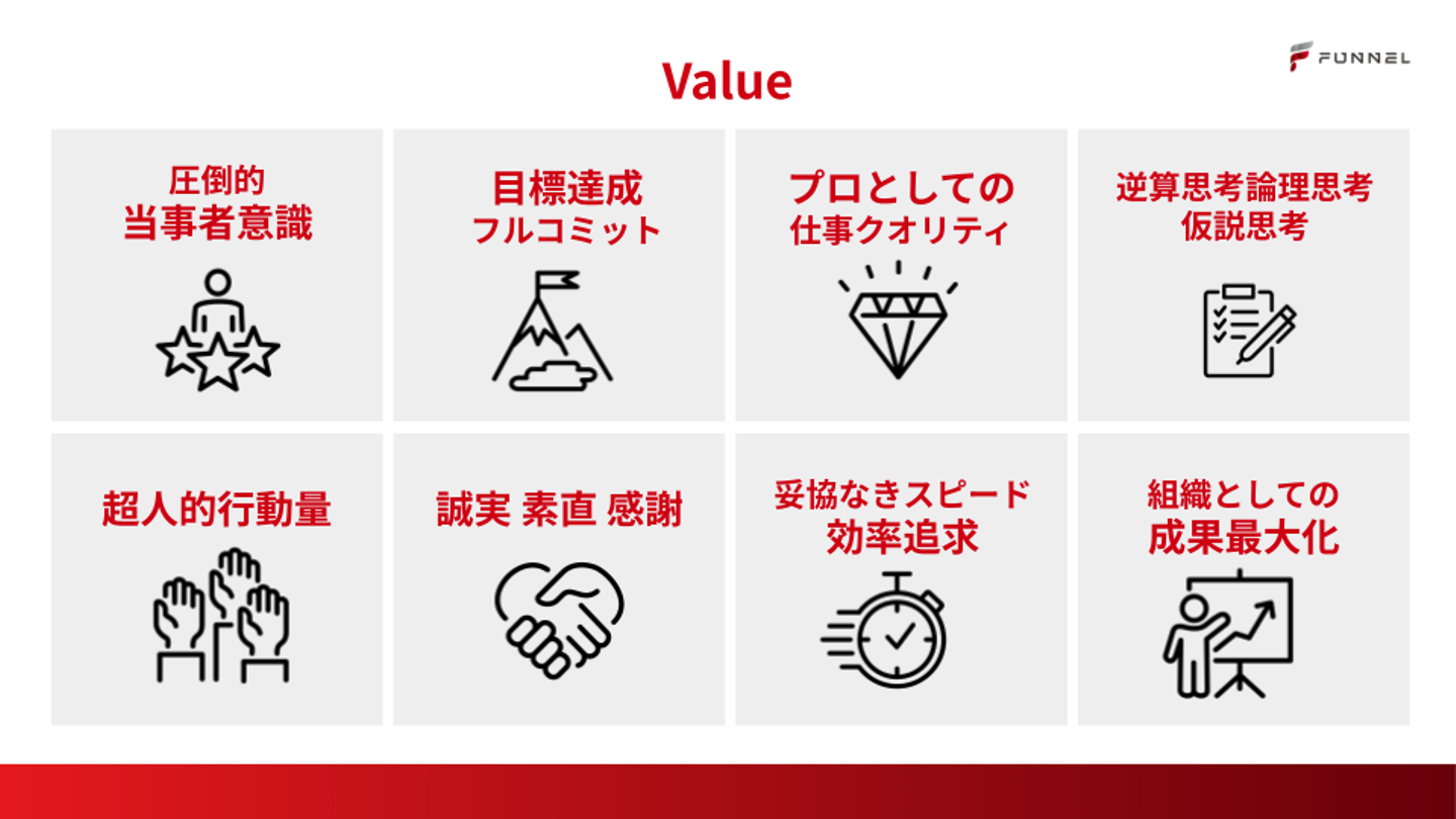 Mさんはエントリーシートの中で自信が体現したバリューを「プロとしての仕事クオリティ」「圧倒的当事者意識」と挙げていましたが、普段働く上で大事にしているファンネルアドのバリューは何ですか?