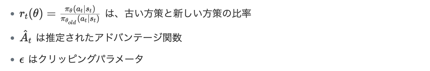 - クリッピング: 方策の比率に上限と下限を設けて安定性を確保