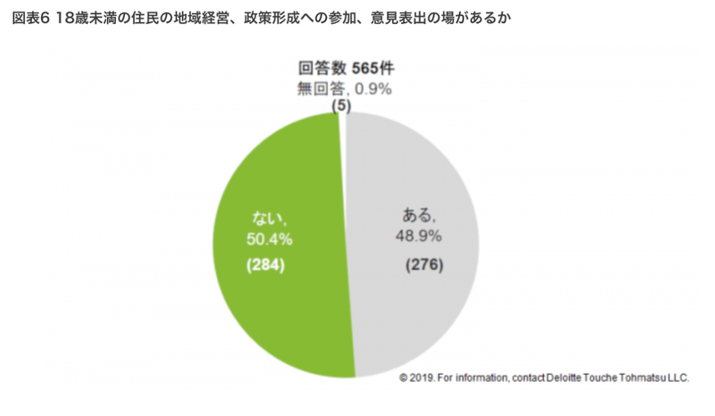 過半数の自治体が、18歳未満の住民の地域経営、政策形成への参加、意見表出の場がないと回答しています。