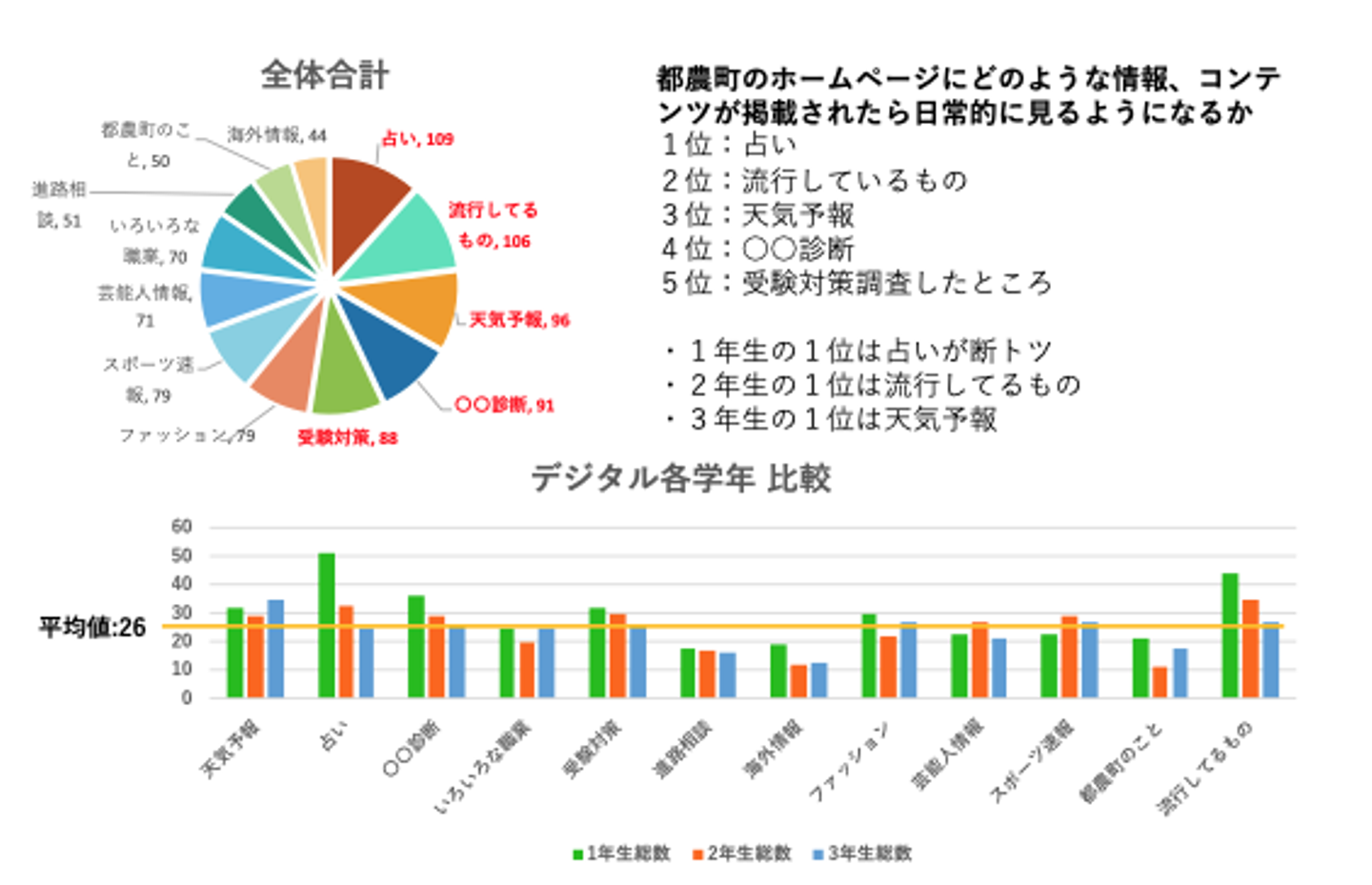中学生の1位はなんと「占い」、2位は「流行しているもの」、3位は「天気予報」。農業が基幹産業の都農町では、天気予報は必須コンテンツ。ただし、中学生が必要な理由はおそらく自転車通学が多いから。