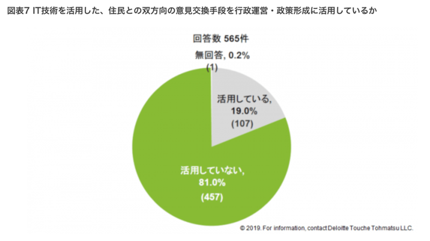 住民と地方自治体のコミュニケーション(住民参画や広報・広聴)の現状や課題、地方自治体の問題意識を明らかにし、今後あるべき地方自治体におけるコミュニケーションの未来を展望することを目的に、全国の市町を対象に実施した「自治体コミュニケーションの未来を展望する調査2019」(トーマツと慶應義塾大学)によると