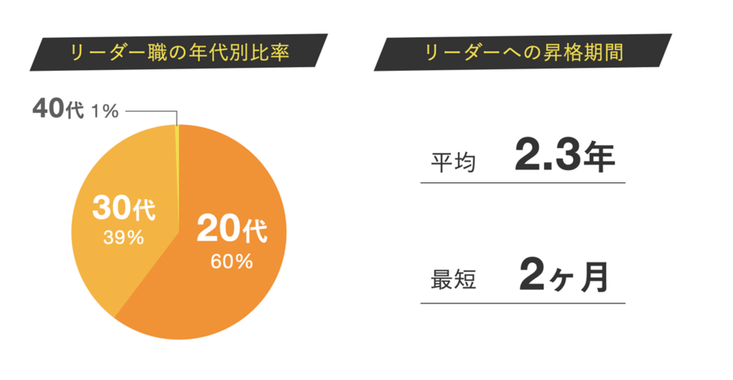 レバレジーズのリーダーは20〜30代が中心。とくに新卒入社社員は、20代でリーダー職になる人が多く、早期からキャリアアップを実現させています。一方の中途入社社員は、入社時にはすでにキャリアの方向性が定まっている傾向が強いので、個人の志向に合わせたキャリアアップを実現させています。第二新卒で入社してリーダーやマネージャーとして縦のキャリアを伸ばす人や、スペシャリストとして仕事を極めていく人など、タイプはさまざまです。