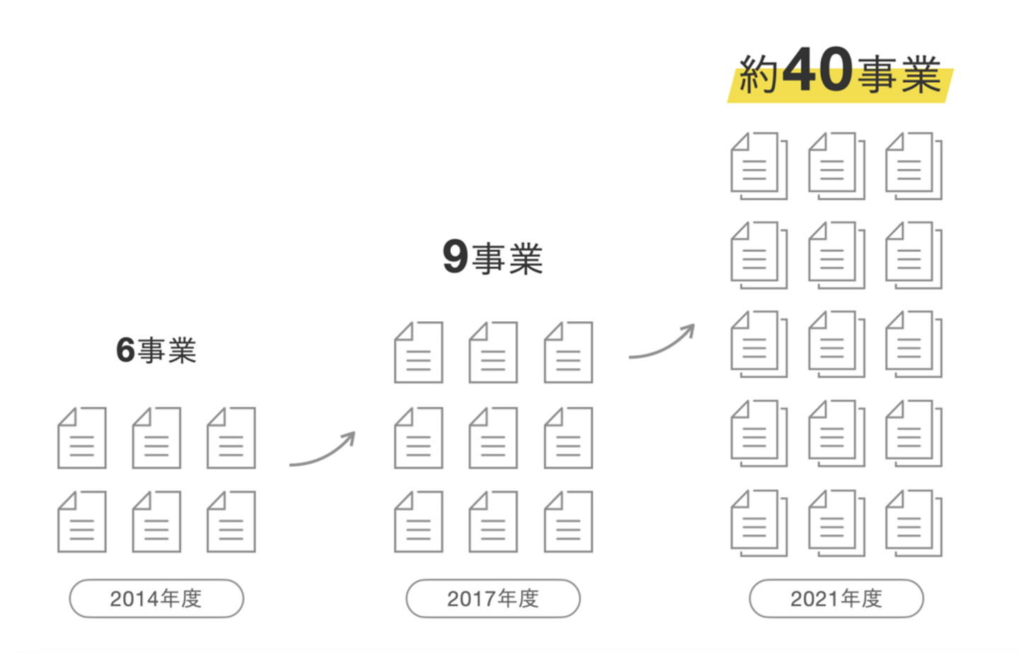 現在は40以上の事業を展開。人材・医療などの既存事業を主軸にすることで、安定した新規事業への投資を実現させています。直近6年間で事業数は5倍に伸び、昨年度も8つの新規事業が立ち上がっています。