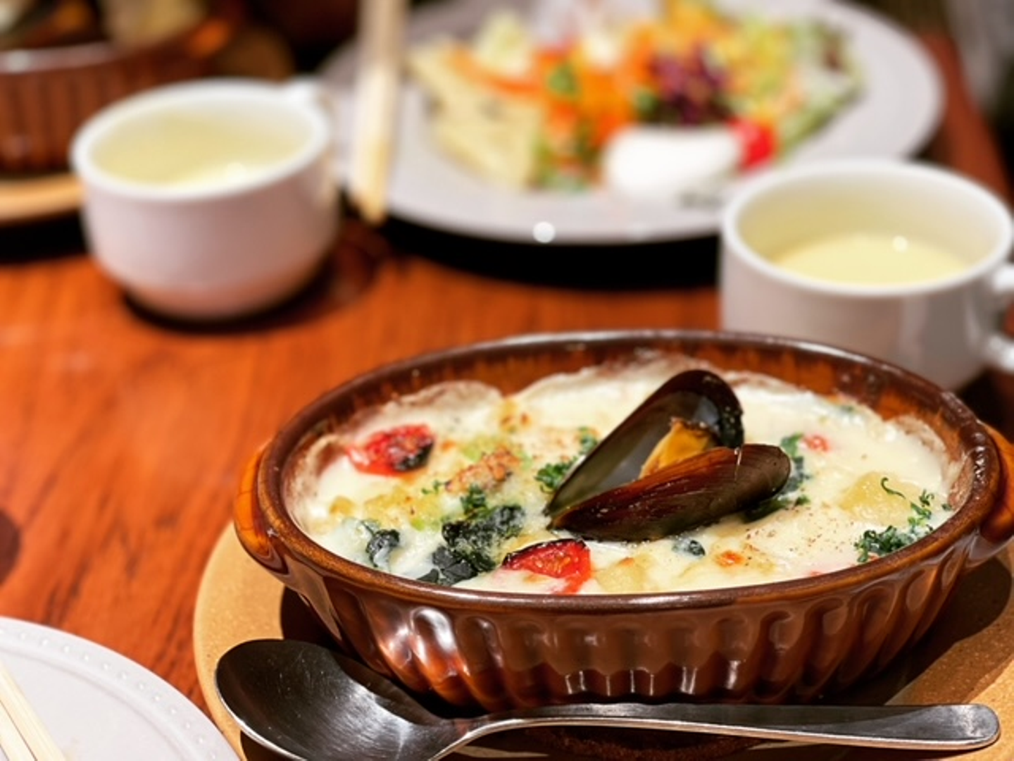 サラダビュッフェ&メイン料理の豪華なランチ。イカリヤハンバーグ、魚介とニョッキの白味噌グラタン…メニュー選び、迷います。。。