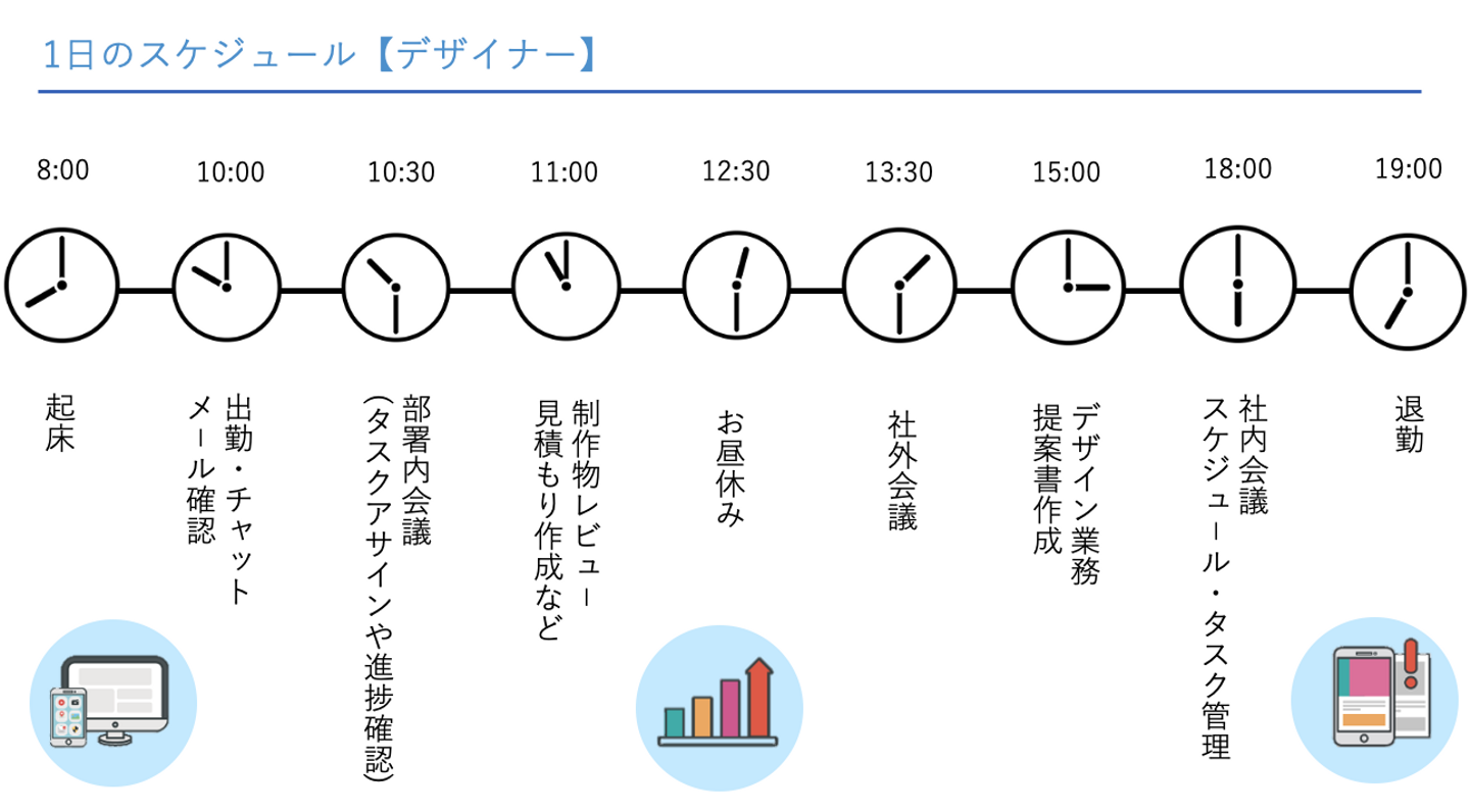 デザイナーのある1日のタイムスケジュールをご覧いただき、サックルで働き方や過ごし方をイメージいただけると嬉しいです。