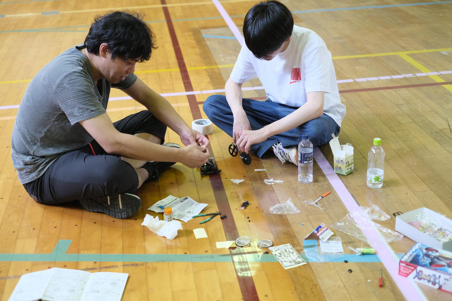 ミニ四駆を見て「懐かしい」という人もいれば「知ってるけど触ったことない」という人もいるので、仲間と協力して早いミニ四駆を作り上げてもらいます。