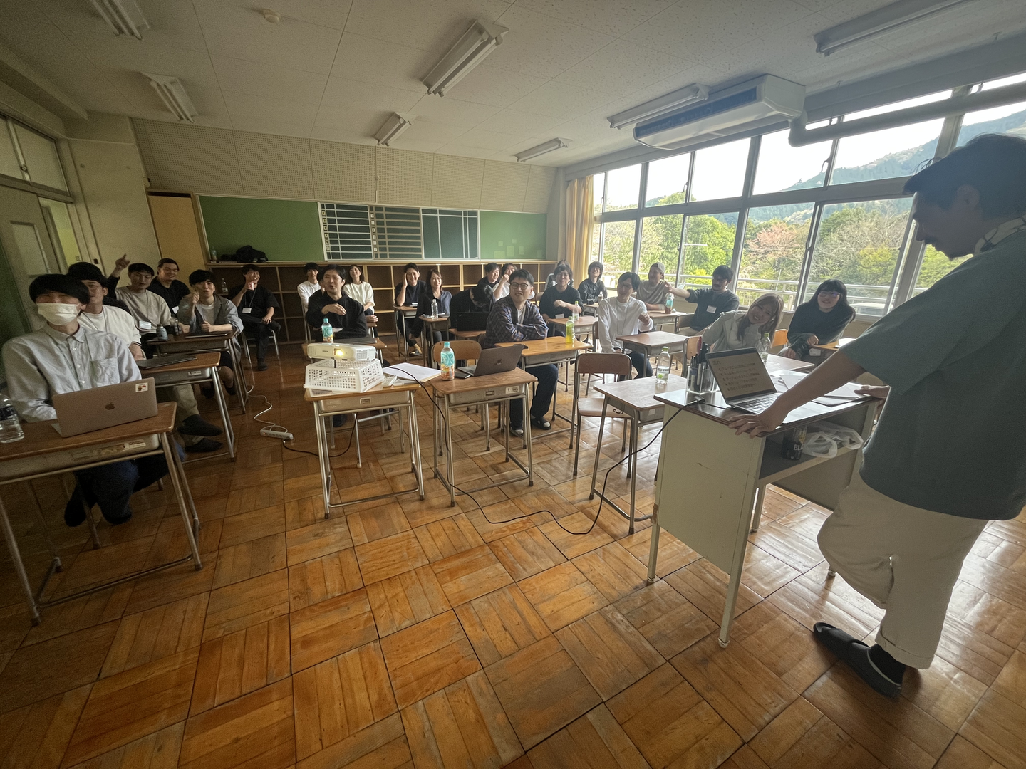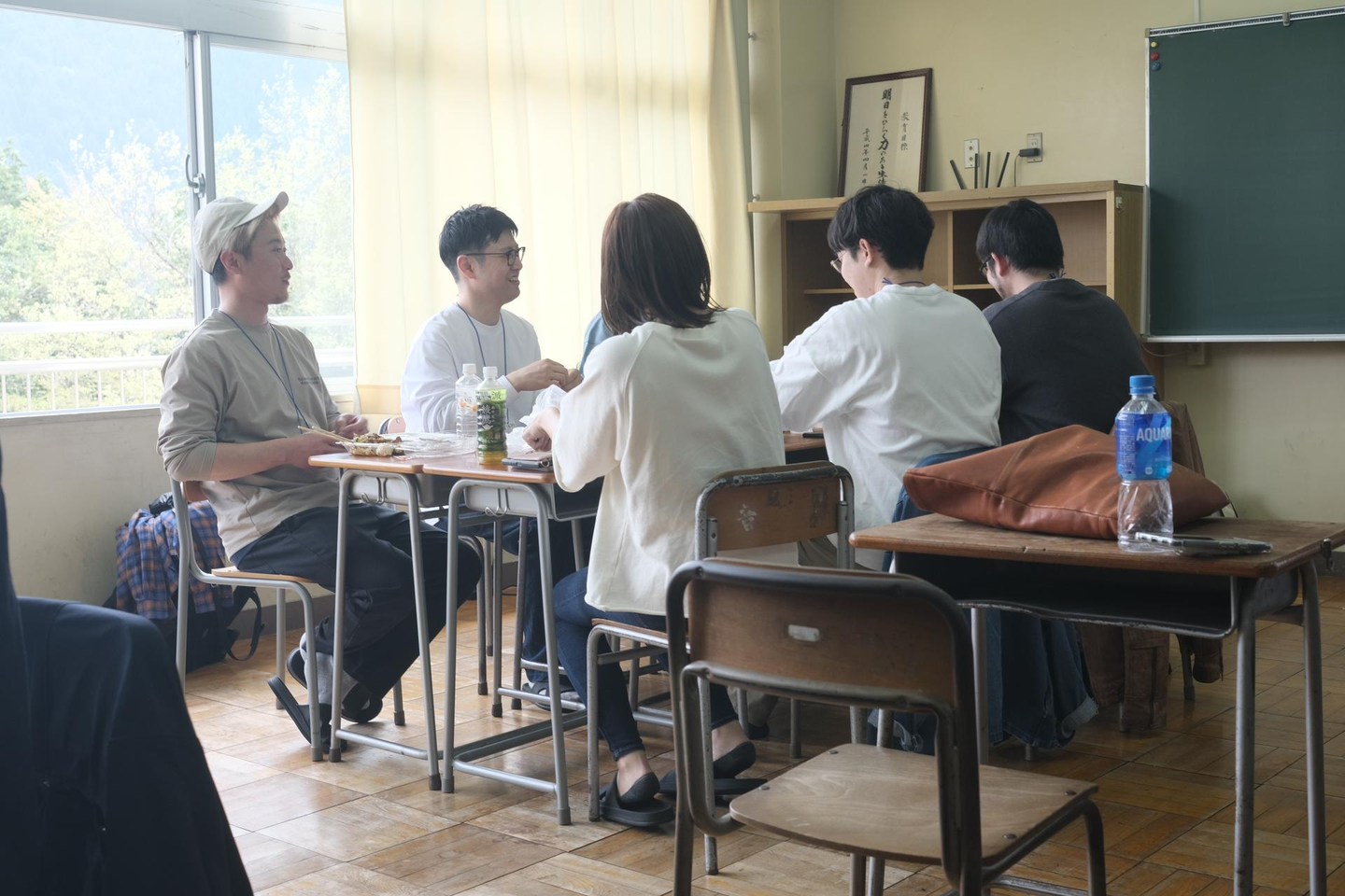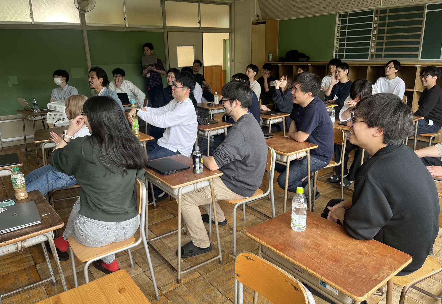 懐かしい学校の椅子と机が並んだ教室で仕事の仲間とわいわいワークするのは、新鮮でワクワクします。