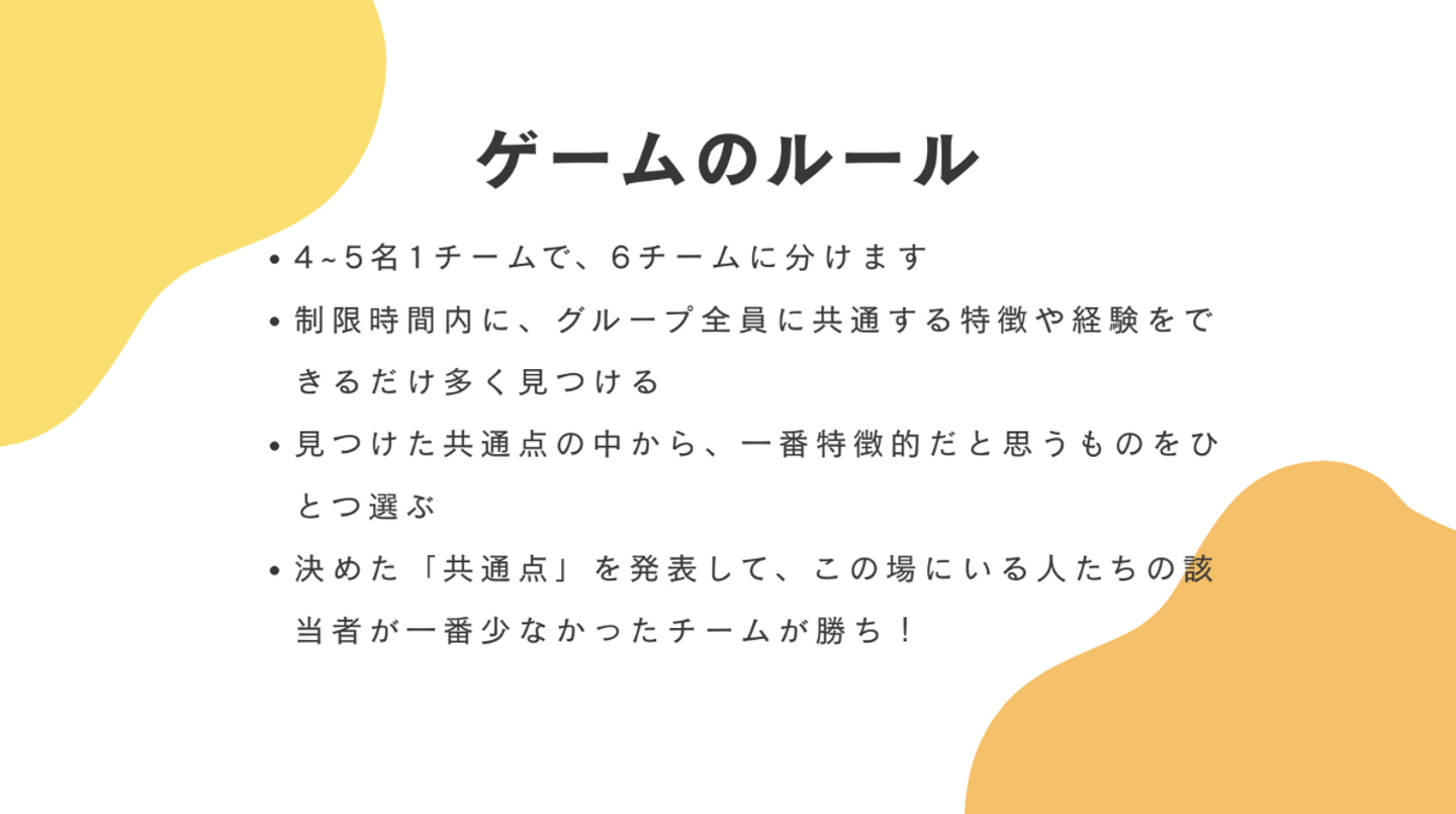 お昼休みの後は、アイスブレイクとして「共通点探しゲーム」を実施。