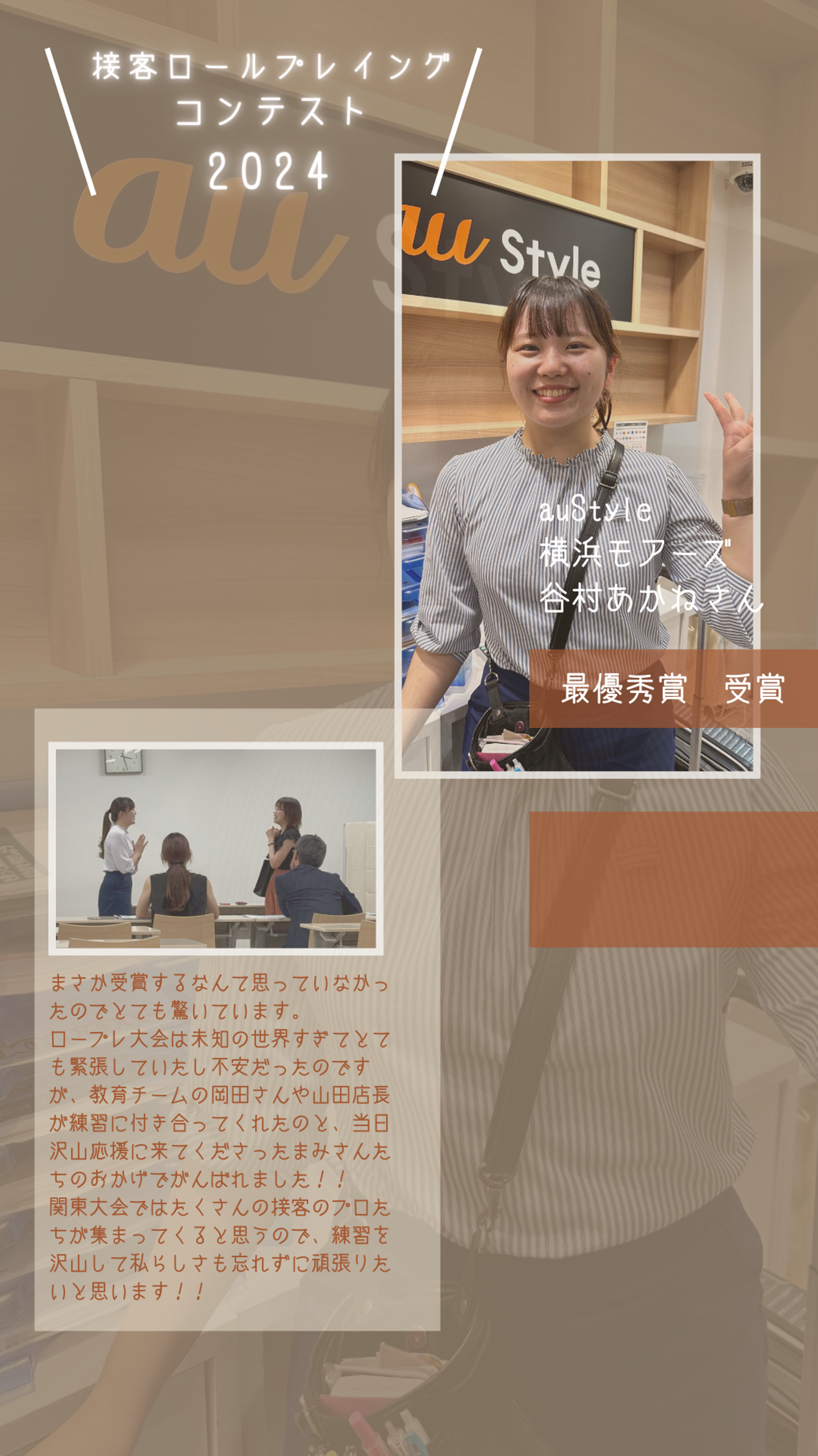 モアーズ大会(配属店舗のビル主催の接客コンテスト)で、まさか私が最優秀賞をいただけるとは思ってもみなかったので、まずはとても驚きました😮✨