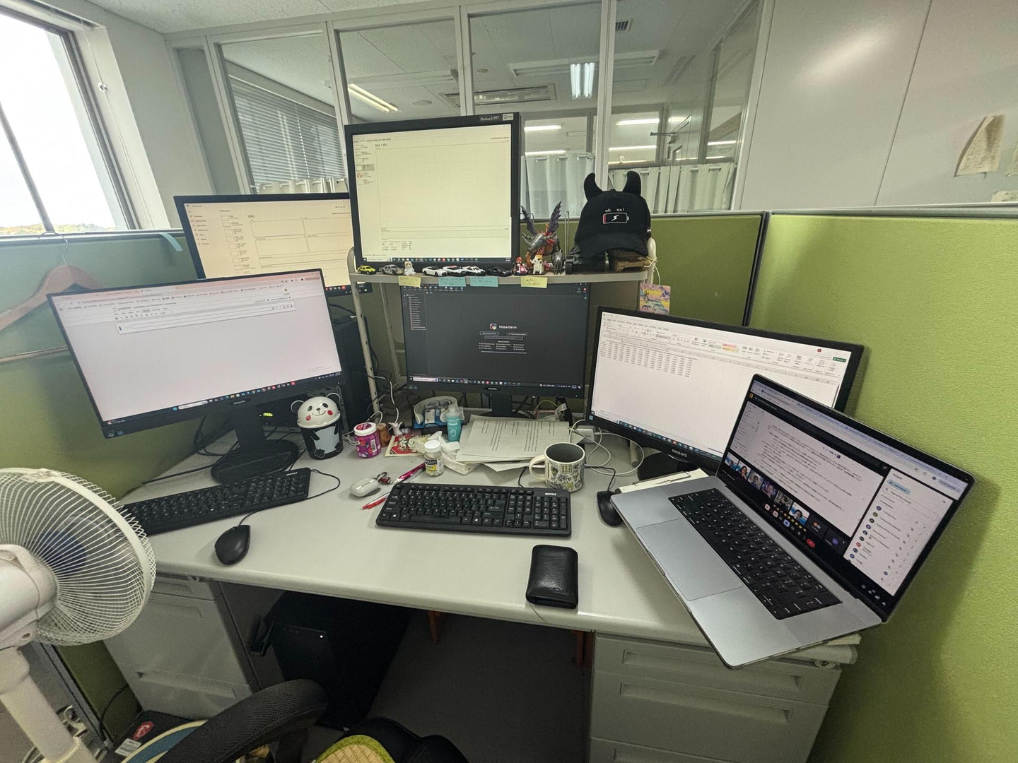 少し変わってると思われるかもしれませんが、私はクラウド上のデータ分析だけではなく、ハードウェアにもこだわりがあります。実は自分でPCをカスタマイズしたり、組み立てたりしています。子供のブロック遊びみたいなものかもしれませんが、高性能のGPUやプロセッサーを好きに選べるのが楽しくてたまりません。それもあって、私のオフィスのデスク周りは...何と言ったらいいかユニークですね。冷却用の扇風機や空気循環装置は飾りではなくて、モデル実行時にパソコンの熱を冷ますために必須なんです。このおかげで冬のオフィスが意外と暖かくなっちゃうんですよ!