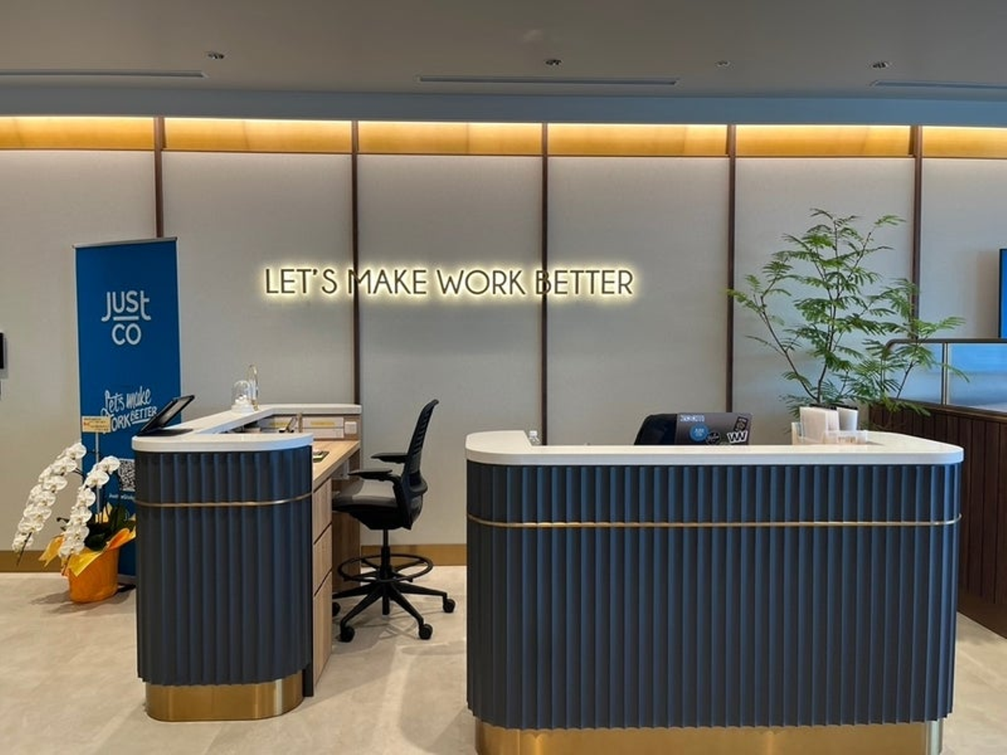 受付スペースには、JustCoのスタッフさんが常駐しています。