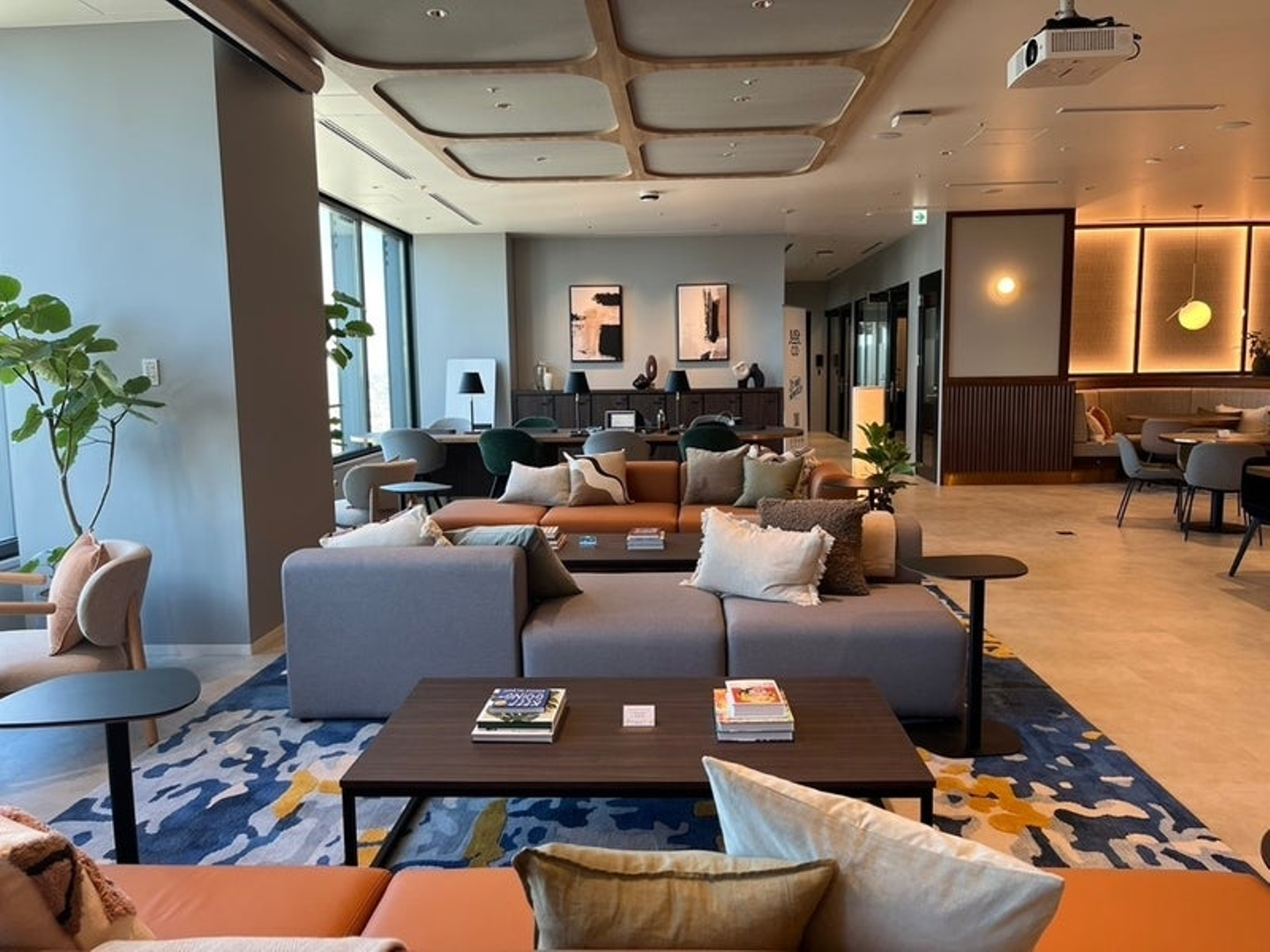 こちらが入居している全ての会社が使用できる共用スペースです。デスクやソファーをはじめ、家具や内装の雰囲気が統一されており、上品な空間を演出しています。
