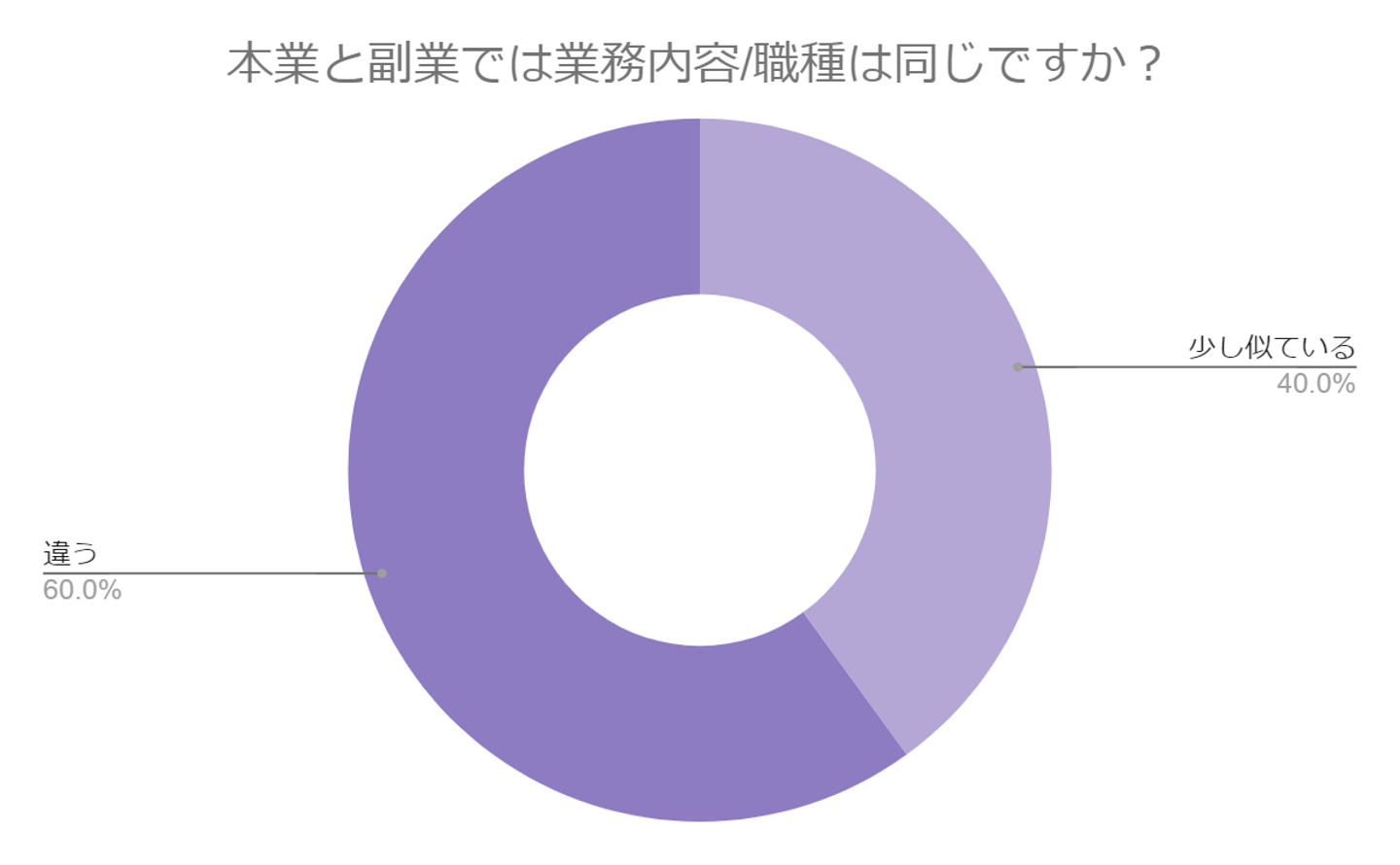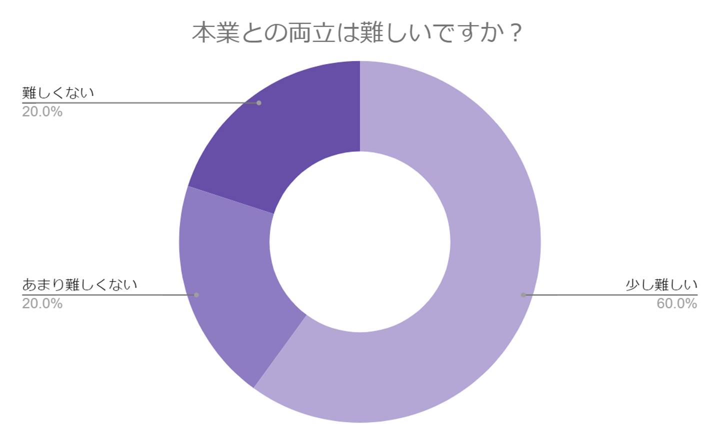 「本業との両立は難しいか?」という質問に対し、「少し難しい」と答えた人が6割、「あまり難しくない」「難しくない」と答えた人が4割という結果になりました。アンケートの選択肢の中には「難しい」が合ったにもかかわらずそれを選択した人がいないということは、「出来ない」「無理がある」と感じている人はいないようです。