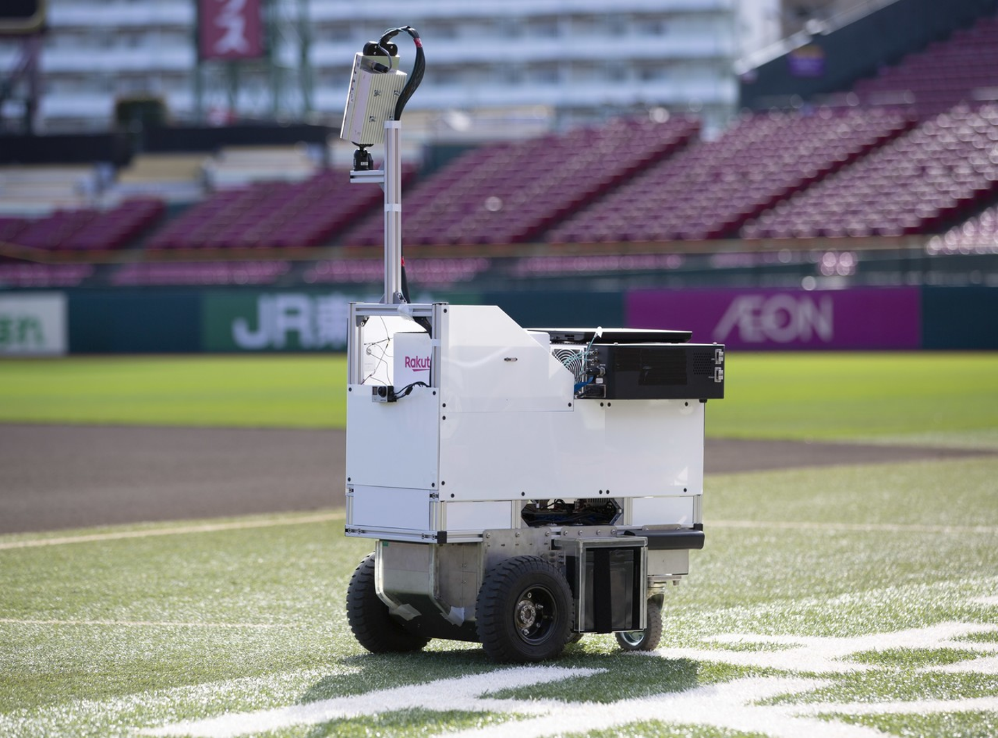 本実験では、5Gの大容量伝送と低遅延の特質を生かし、楽天技術研究所(RIT)が宇都宮大学と連携して開発した自動配送ロボットに搭載した5G端末と、ロボット上のカメラで撮影した4K映像を用いて、リアルタイムでスムーズな遠隔操作および高精細な映像による本人確認などの遠隔管理ができることを確認しました。これにより、将来的にスタジアム内で注文した商品の配送や、ラストワンマイルにおける配送ロボットの実用化等が期待されます。