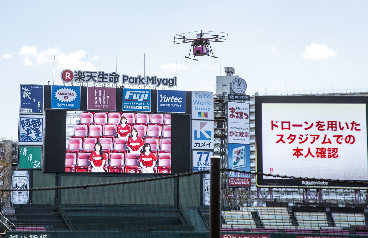 本実験では、「楽天ドローン」が保有するドローンから撮影した映像を5Gネットワーク経由で伝送し、スタジアム内の人物特定等が実施できることを確認しました。これにより、スタジアムでのエンターテインメントや、特定の人物への物の配送およびサービス提供等にも活用が期待されます。