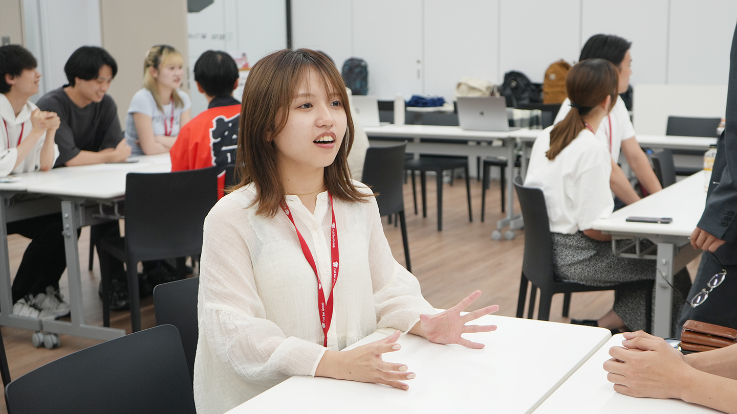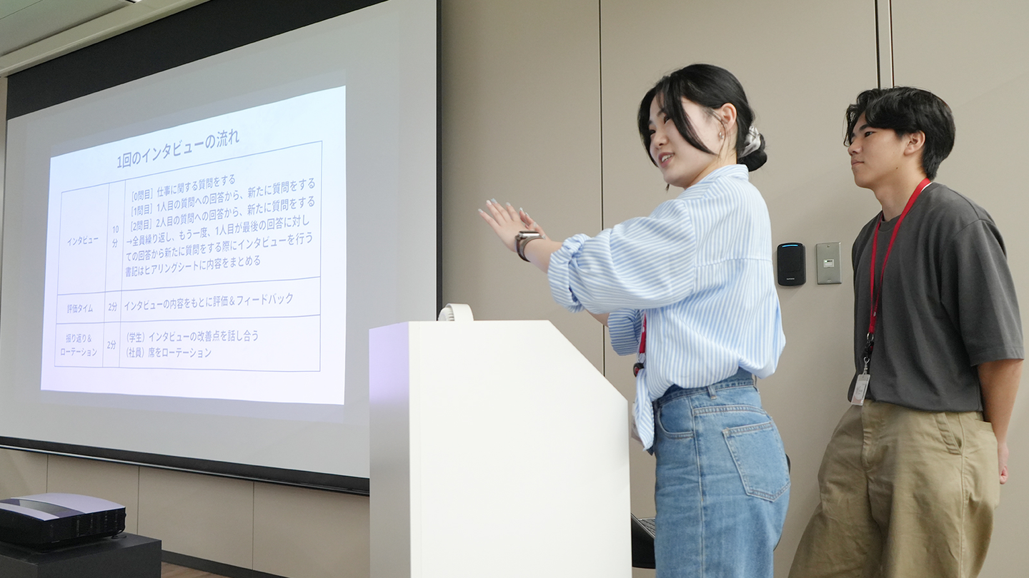 インターン生がひとり一問一答スタイルで質問を投げかけ、各グループのインタビューが終わる毎に社員からの採点が行われました。「具体的な仕事内容」や「なぜこの仕事をしているのか」、「やりがいを感じる瞬間」など、普段はなかなか聞くことのできないことを直接伺うことができました。