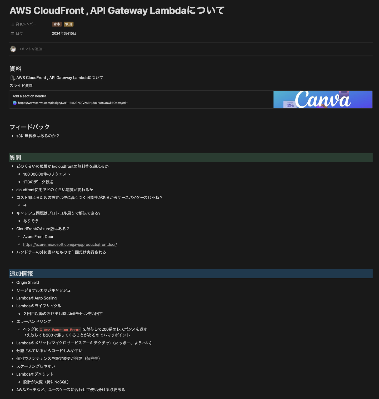 次に、サーバーレスコンテナでお馴染みのLambdaについて坂田くんがコアな部分まで調査して発表してくれました。