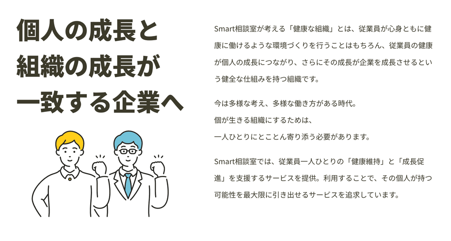 「働く人の『モヤモヤ』を解消し、『個人の成長』と『組織の成長』を一致させる」をミッションに、法人向けオンライン対人支援プラットフォームを開発、運営しています。 主なサービスとして、社外相談窓口サービス「Smart相談室」とコーチングサービス「Smartマイコーチ」を提供しています。