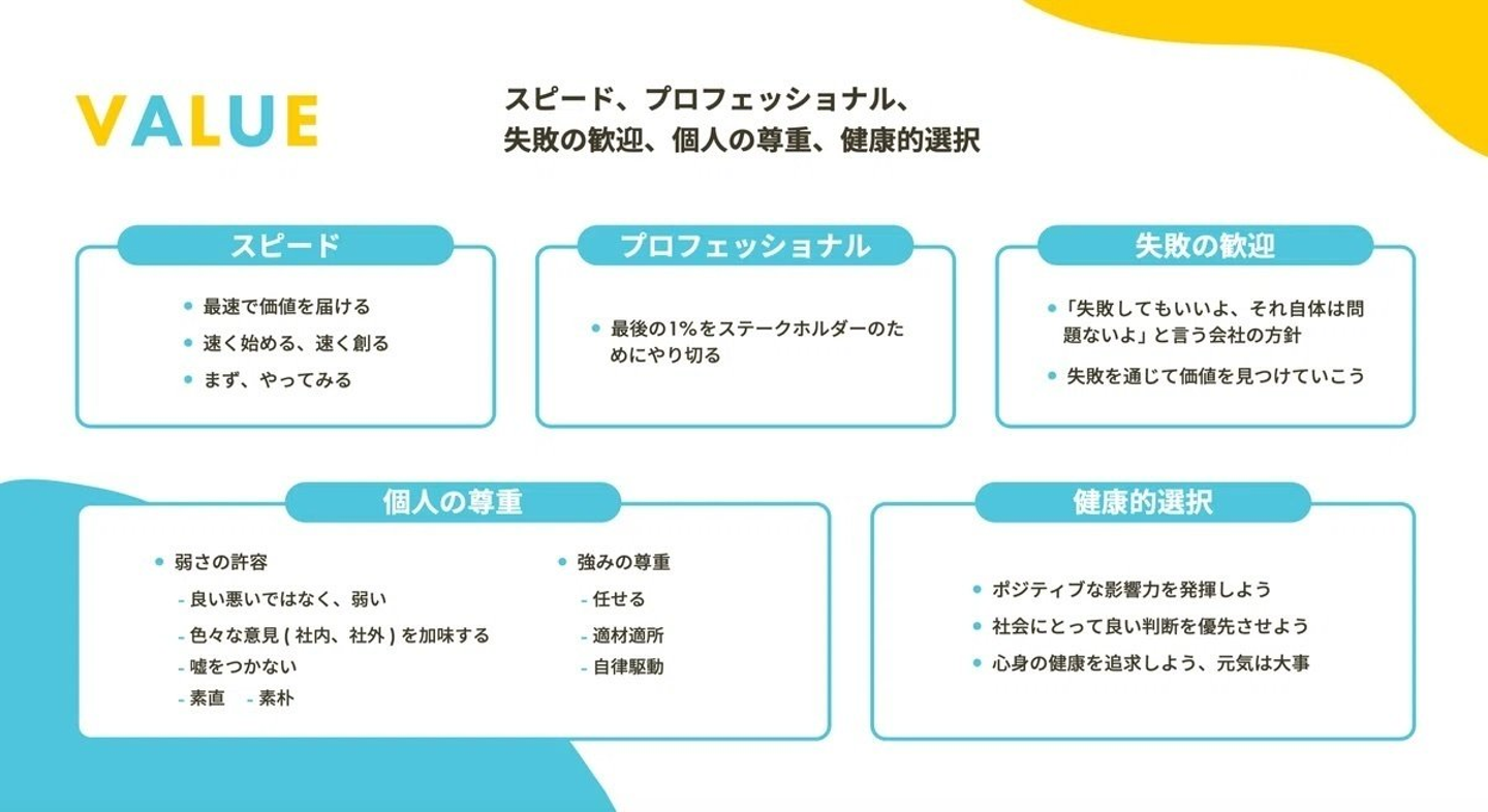 ●5つのバリュー「スピード」「プロフェッショナル」「失敗の歓迎」「個人の尊重」「健康的選択」