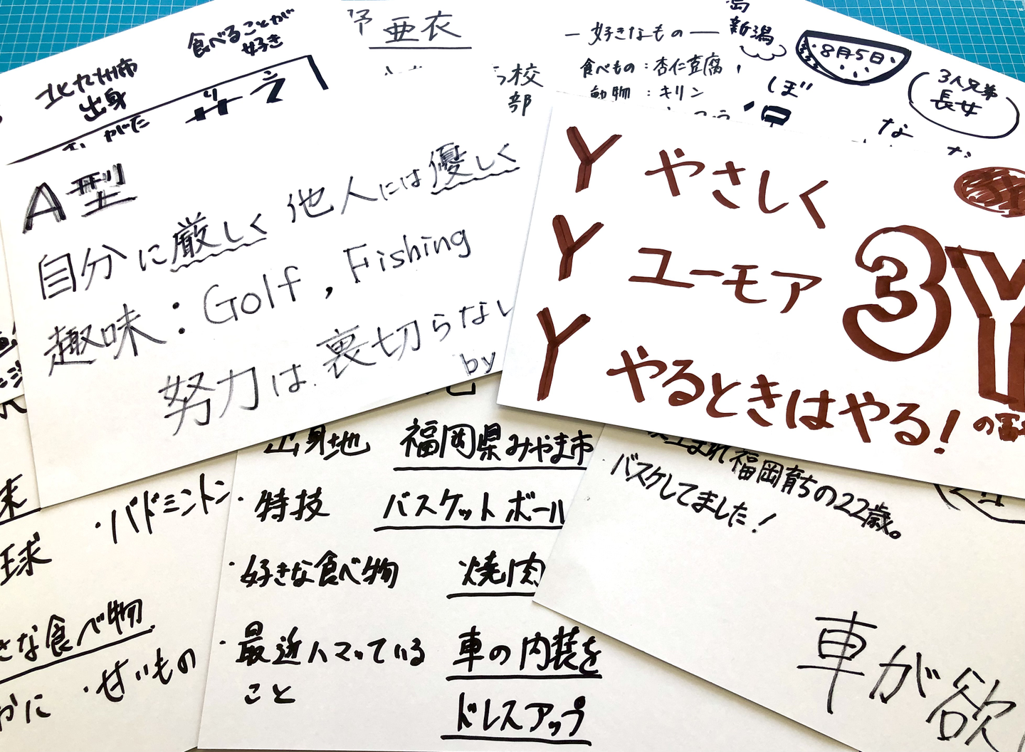 さて、自己紹介ですが、「何でも良い」と言ったので、本当に思いつくままに各自、自由に書いてくれました。思いつく限り自分のアピールポイントを羅列したり、別の新人は思い浮かばず頭を抱えてみたり、デザイン課の新人はイラストを交えて楽しそうに、3つの「Y」で自分を表現する斬新な自己表現をする人も現れました。