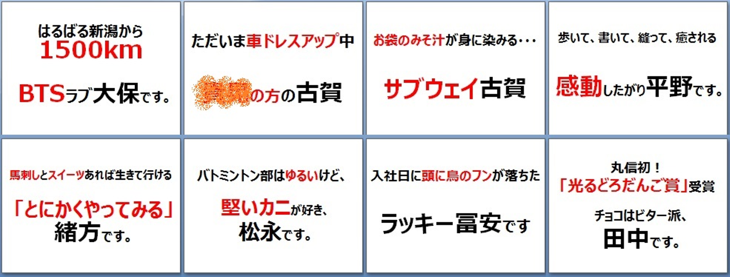 と、いろいろ偉そうに言ってはみたものの、じゃあ本来どんな自己紹介が良かったの?と質問されそうだったので、事前に入手した新卒8人のプロフィールから、全員分のキャッチコピーを作ってみました(※一部、仮名にしてます)。
