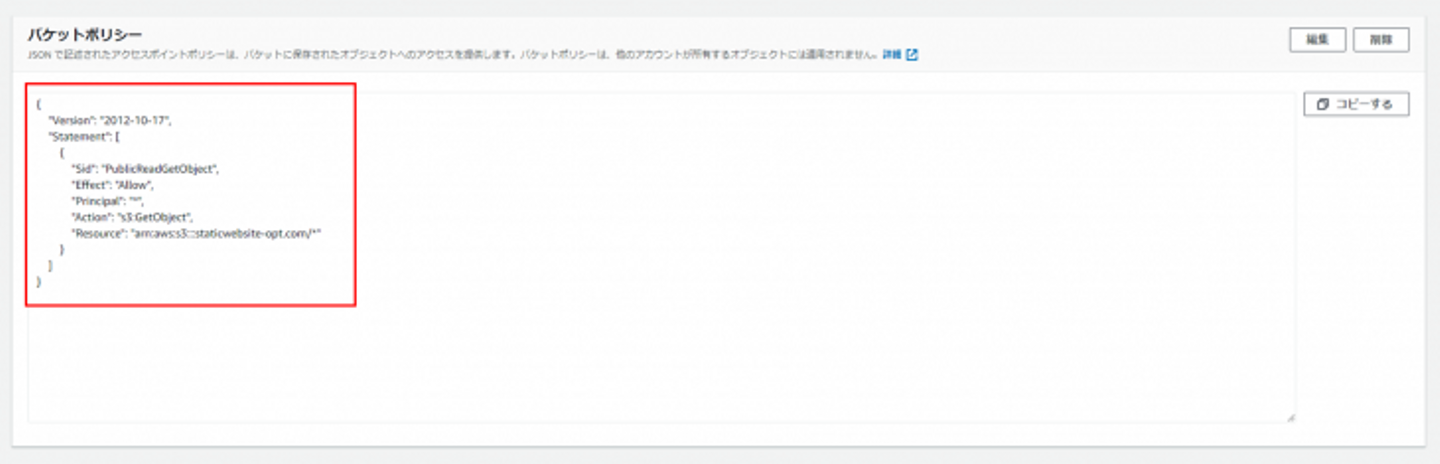 上記ポリシーのバケット名の部分を作成したS3バケット名に変更します。