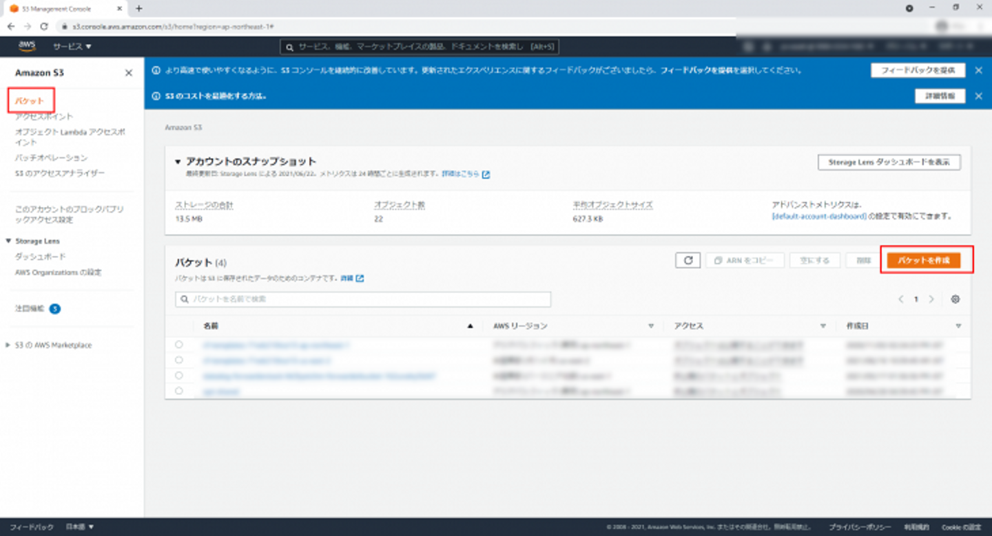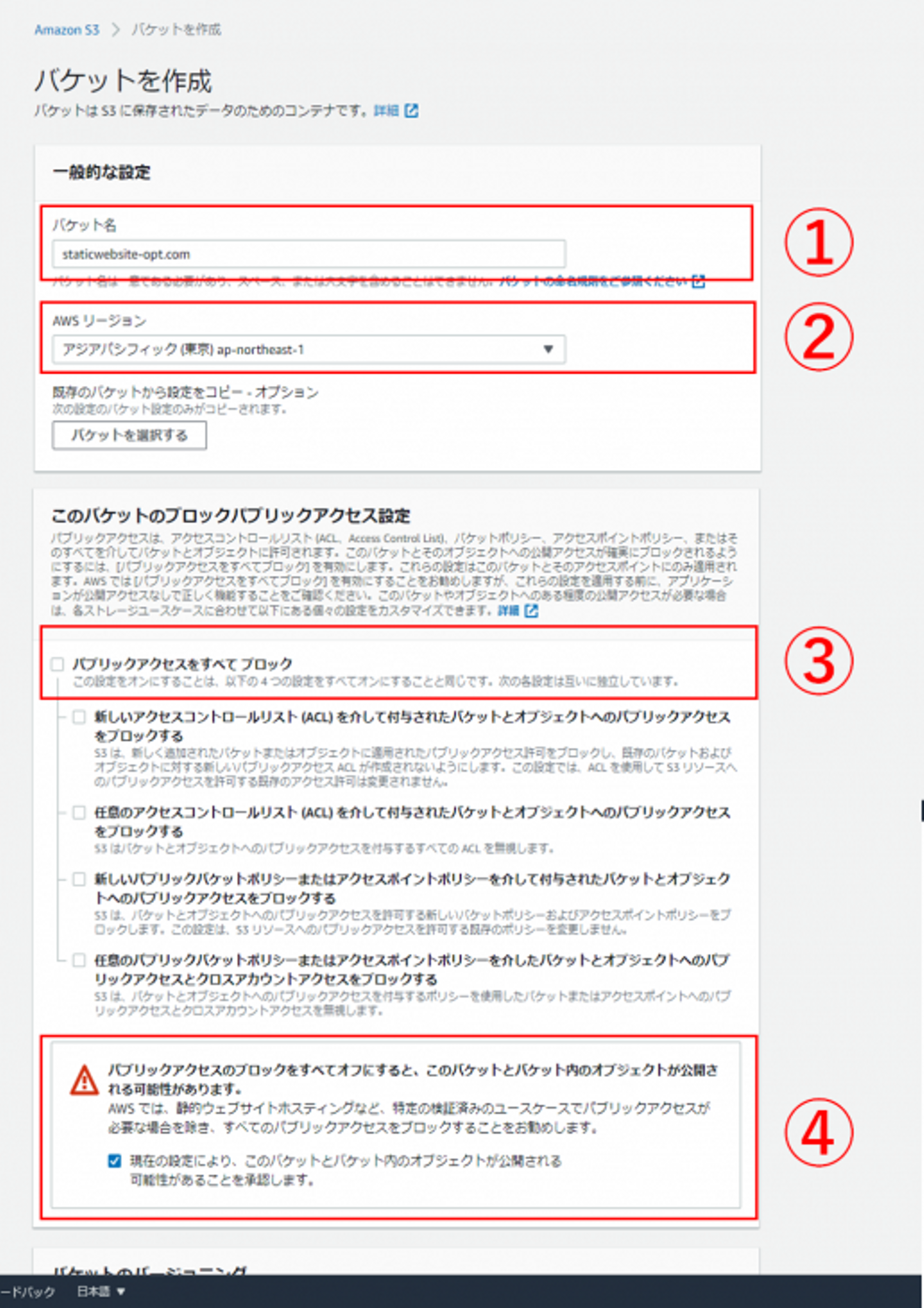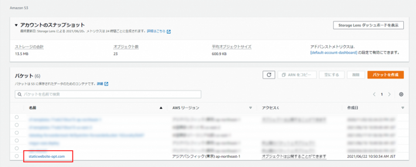 そのほかはそのままで、ページ一番下の バケットを作成 を押します。