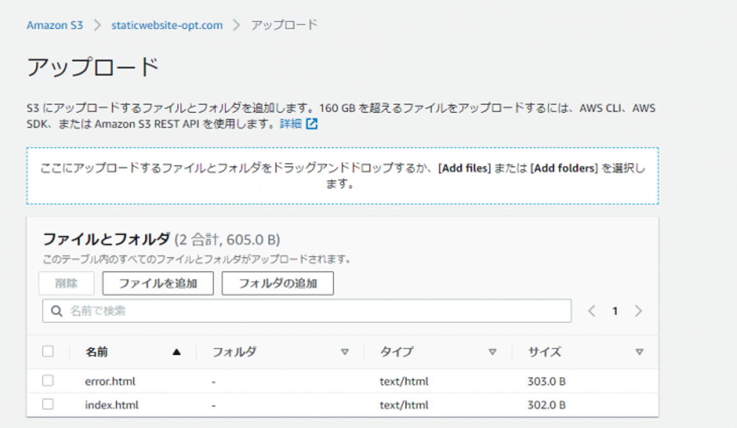 作成したバケットにindex.htmlとerror.htmlをアップロードします。