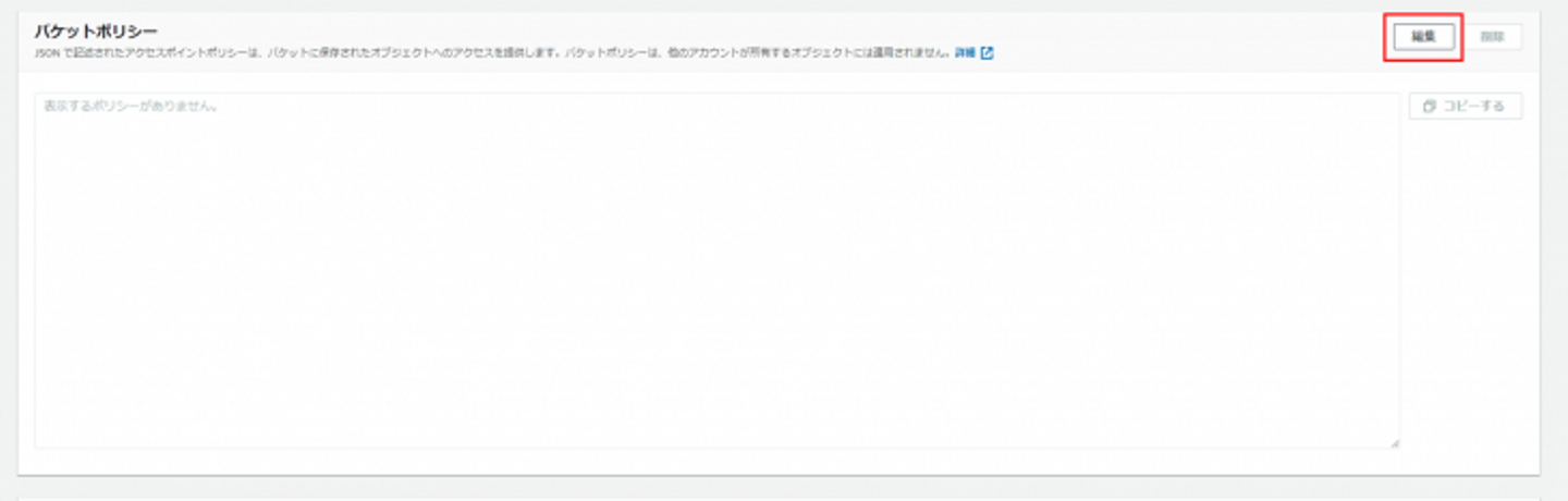 この時点ではまだ何もポリシーが設定されていません。 バケットポリシーの 編集 を押します。