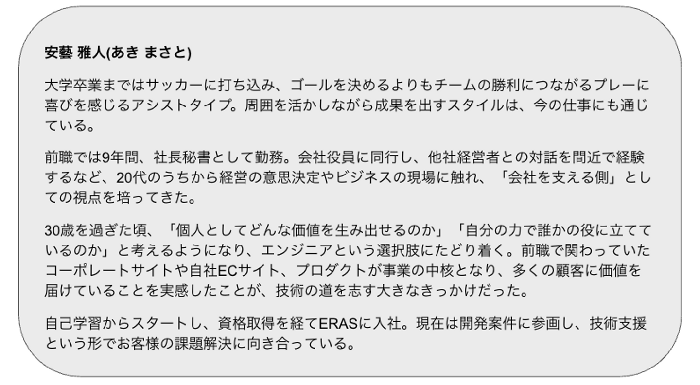 エンジニアとして働く上で、技術のキャッチアップは避けて通れない課題です。今回は、日々の業務を通じて自身の課題を見つけ、ストイックに学習を続ける安藝 雅人(あき まさと)さんにインタビューを実施。現場で求められる知識の深さや、継続的な学習のコツ、そして休日の過ごし方について語ってもらいました。