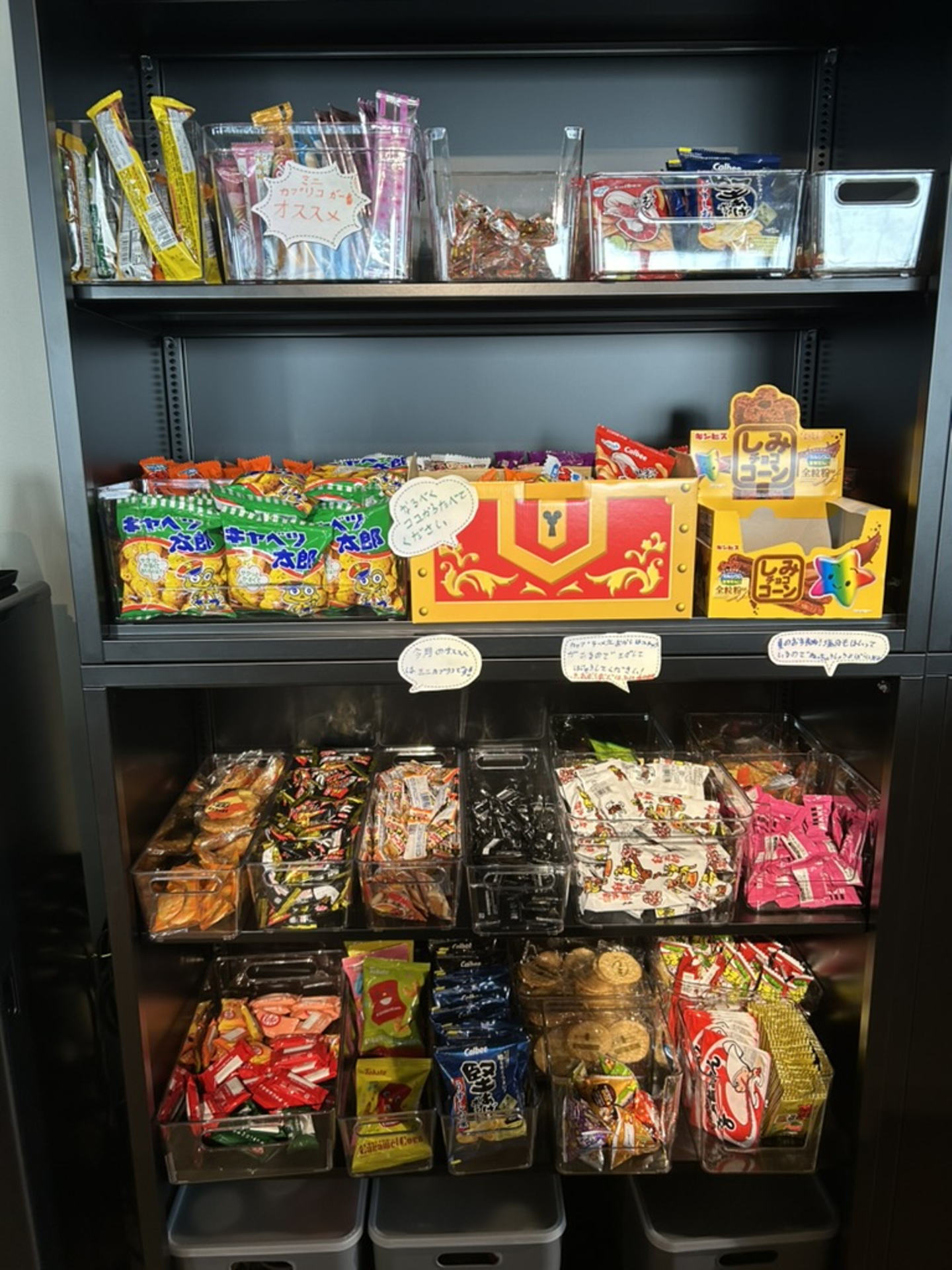 社員同士で「カルパス美味しいよね〜」とか「同じお菓子を二つ同時に持ってっちゃダメ!」なーんて話をしながらみんなでワイワイ食べながら仕事をしています。