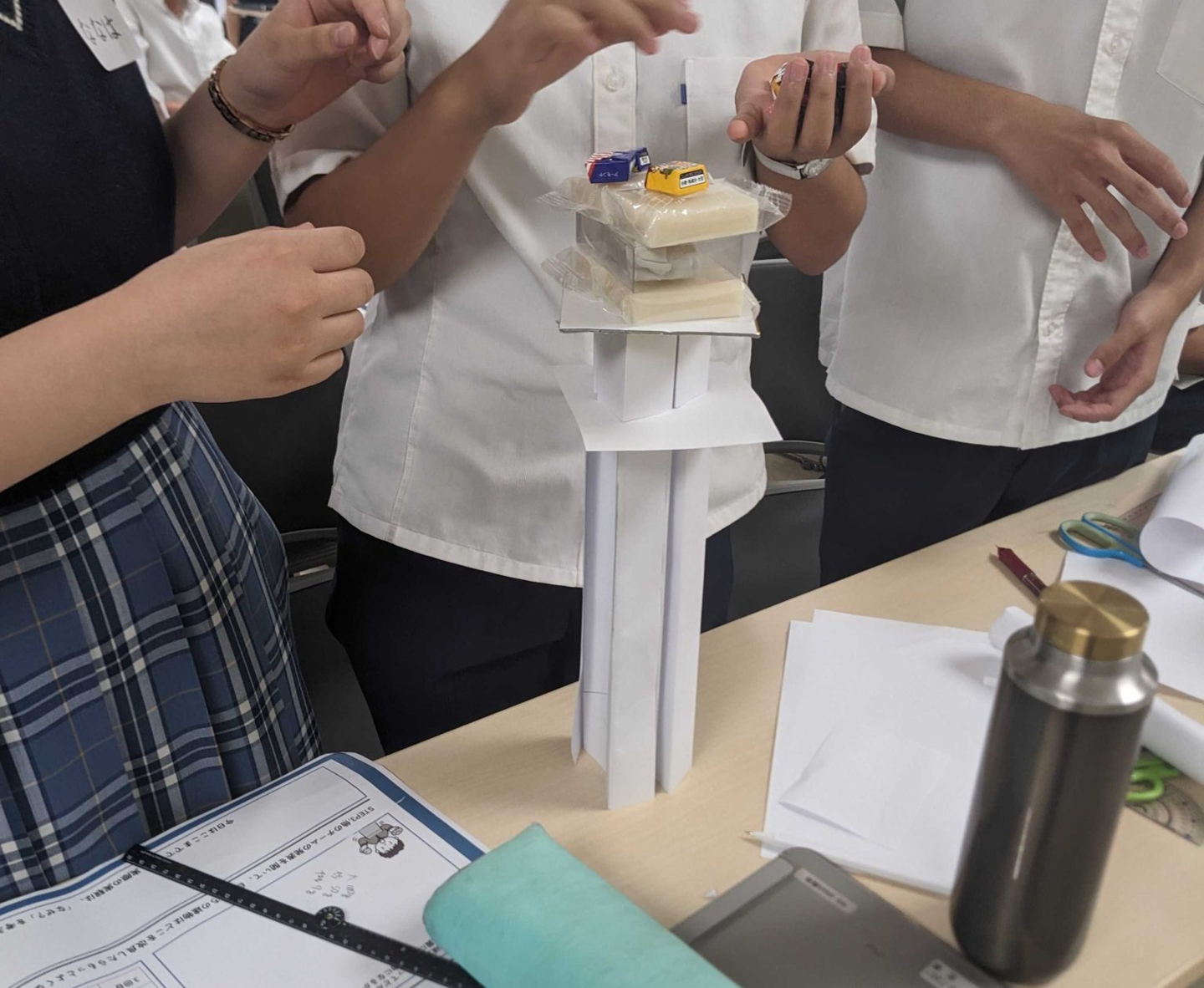 コピー用紙だけで頑丈な建物を作るというワークショップでは、他の班よりも高さがあって重さにも耐えられる建物を建てようとチームで協力している様子でした!