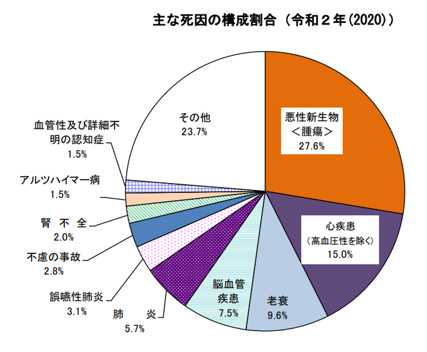 生活習慣病とは、生活習慣が発症の要因となる疾患です。偏った食生活・運動不足・飲酒・喫煙など、好ましくない習慣が長年続くことで、「がん(悪性新生物)」「心疾患」「脳血管疾患」などの大病へと進行し、気づいた時には元の健康な身体に戻ることが困難になります。
