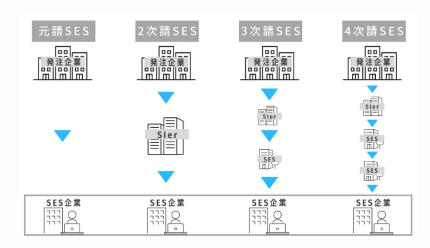 上記の図のように、3次・4次請負SESだけでなく、ひどい企業になると5次・6次請負SESもあります。