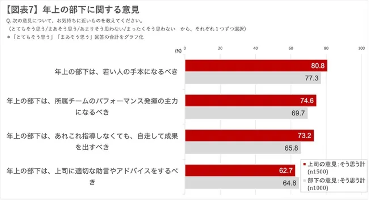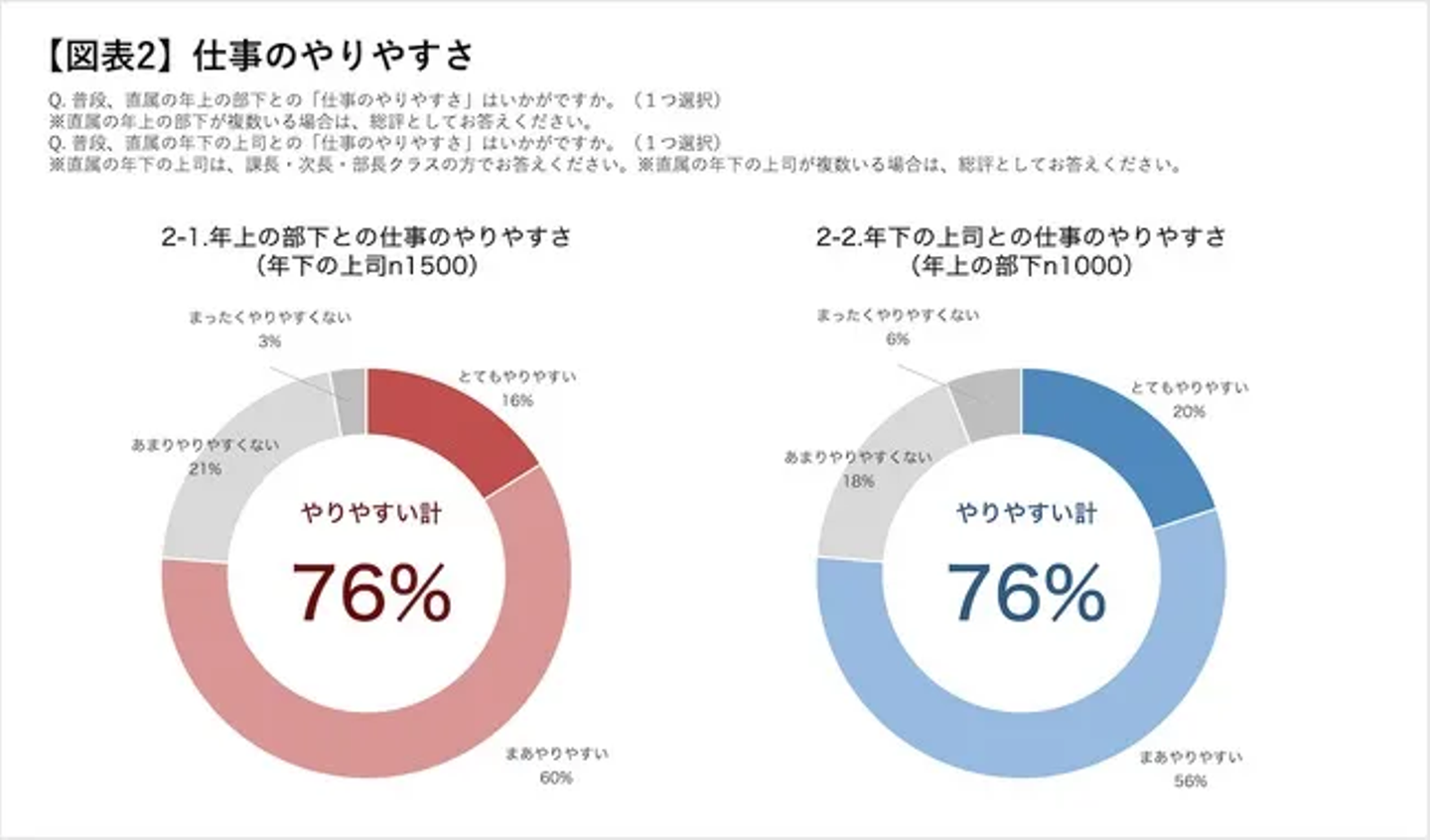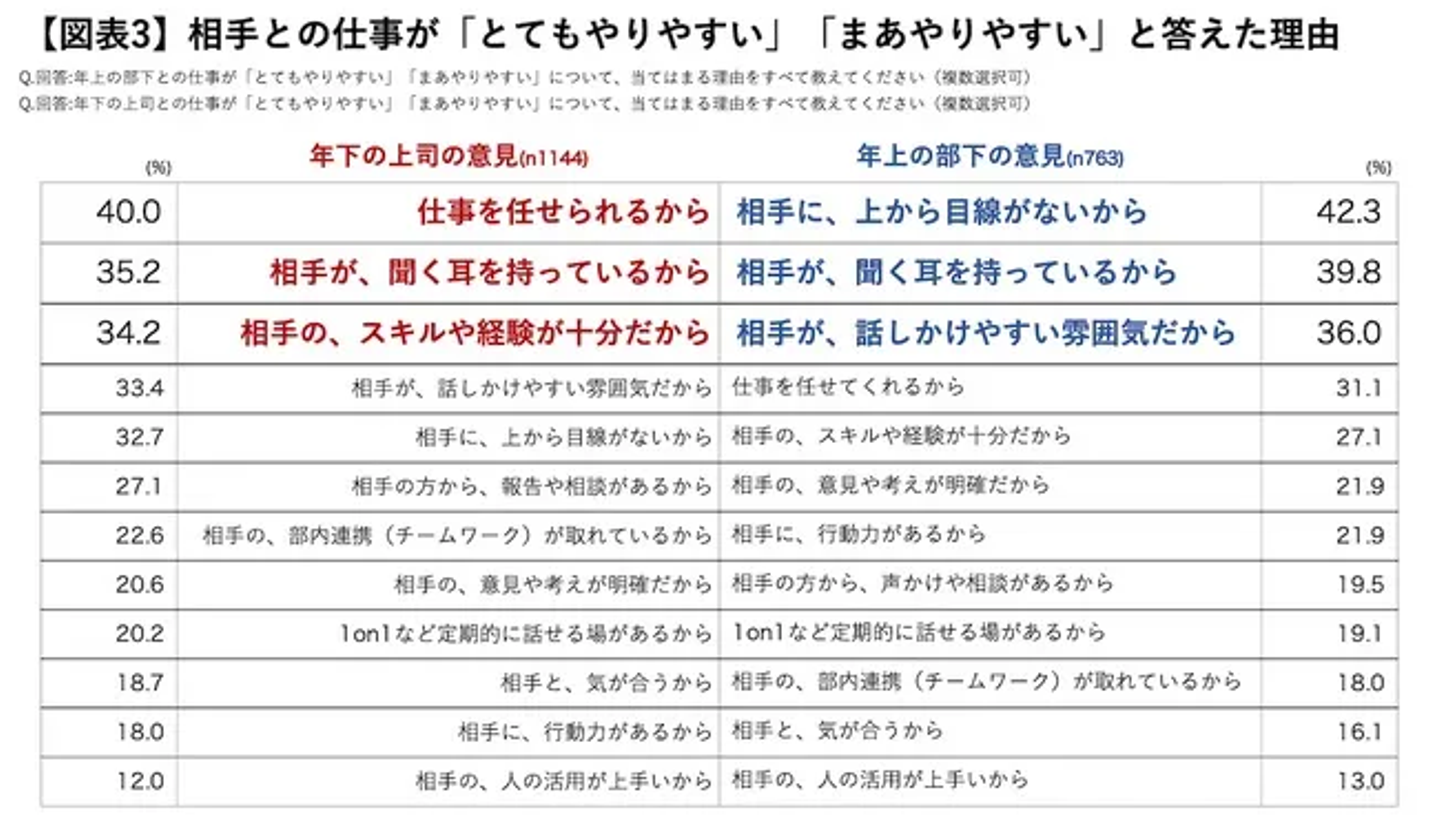 一方、“年上の部下”側の上位3つは、「相手に上から目線がないから」(42.3%)、「相手が聞く耳を持っているから」(39.8%)、「相手が話しかけやすい雰囲気」(36%)という結果となり、年下の上司との接しやすさや相談しやすさに関わる理由が上位に上がり、この結果は相互のコミュニケーションや協力が円滑であることを示しています。