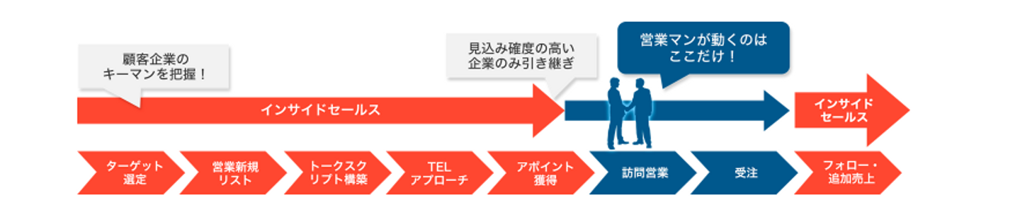 インサイドセールスは、訪問する以外の全てのフローに対して「訪問する必要がある営業活動」以外のすべてを担うことが可能です。