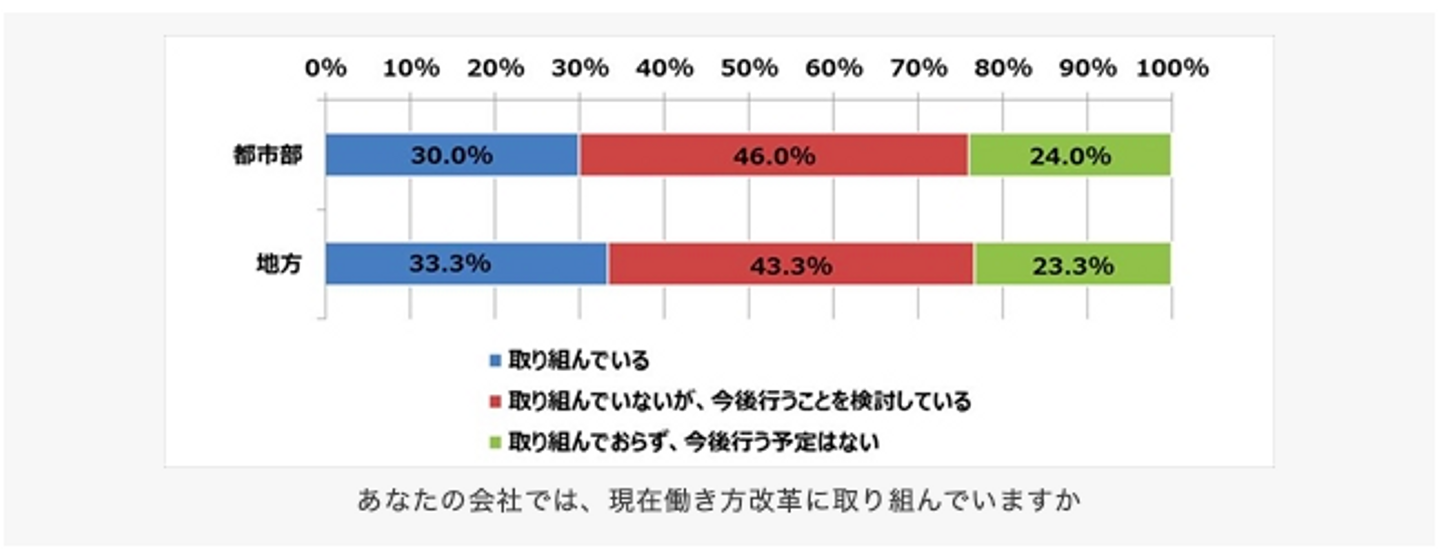 今までの働き方改革の取り組み状況を聞くと、「取り組んでいる」と答えた割合は都市部で30.0%、地方で33.0%。