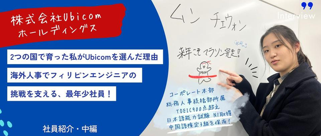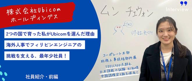 こんにちは!Ubicomホールディングス採用担当です。今回は、Ubicomホールディングスのコーポレート本部 総務人事統括部所属のムン・チェウォンさんにお話をお聞きしました!Ubicomホールディングスで最年少社員として活躍するムンさんは、フィリピンから来日するエンジニアを支える「海外人事」です。日本と韓国、2つの国を行き来しながら育った経験が、今の仕事にどう繋がっているのでしょうか。前編では、ムンさんが国境を越えて働く人々をサポートしたいと考えるようになった原点と、Ubicomへの入社の決め手に迫ります。【社員プロフィール】:ムン チェウォンさんコーポレート本部 総務人事統括部所属。2...