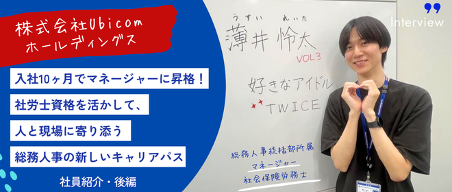 こんにちは!Ubicomホールディングス採用担当です。引き続き、コーポレート本部 総務人事統括部所属の薄井さんにお話をお聞きしました!中編では、入社からわずか10ヵ月でマネージャーに昇格した現在の心境や、成長を実感した瞬間、現在の業務内容について深掘りします!【社員プロフィール】:薄井 怜太(うすい れいた)さんコーポレート本部 総務人事統括部所属。マネージャー / 社会保険労務士2024年入社。岡山県出身。大学進学を機に上京しました。新卒では人材派遣会社に入社し、その後は社労士法人で経験を積み、Ubicomホールディングスに入社しています。趣味は動画視聴やゲーム、散歩です。特に「どうぶ...