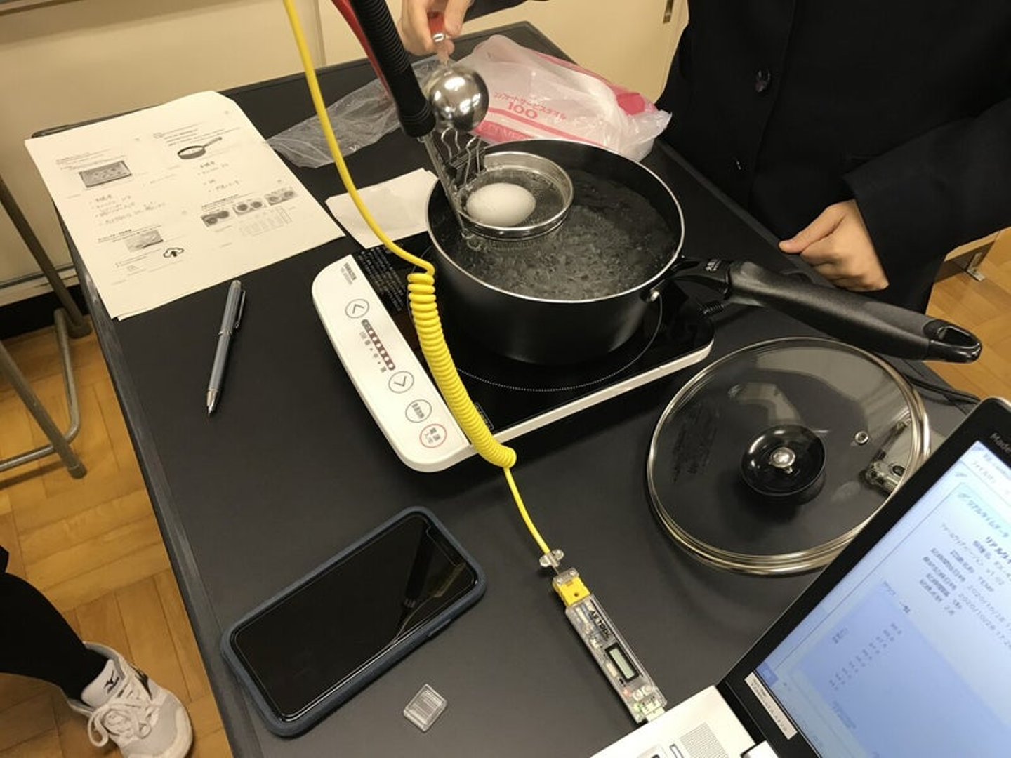 前半の時期は、AIの基礎を座学で学ぶ以外に、演習や実習を実施。実際にAIを動かす演習や、ゆでたまごをゆでる温度遷移をセンサーで測定し、取得したデータからAIで黄身の固さを判定する実習を行いました。その他にも、IBUKIに赴いてAIを使ったものづくりの事例を学んだり、プロサッカーチームのモンテディオ山形を訪問して強化部スタッフの方にデータ分析のお話をうかがい、実際に試合を観戦するといった実地見学もしました。