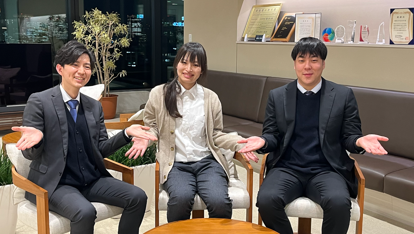 プロジェクトリーダーの熊谷たかよしさん、技術担当の古屋れいたさん、そして新卒メンバーの白岩まひろさん。