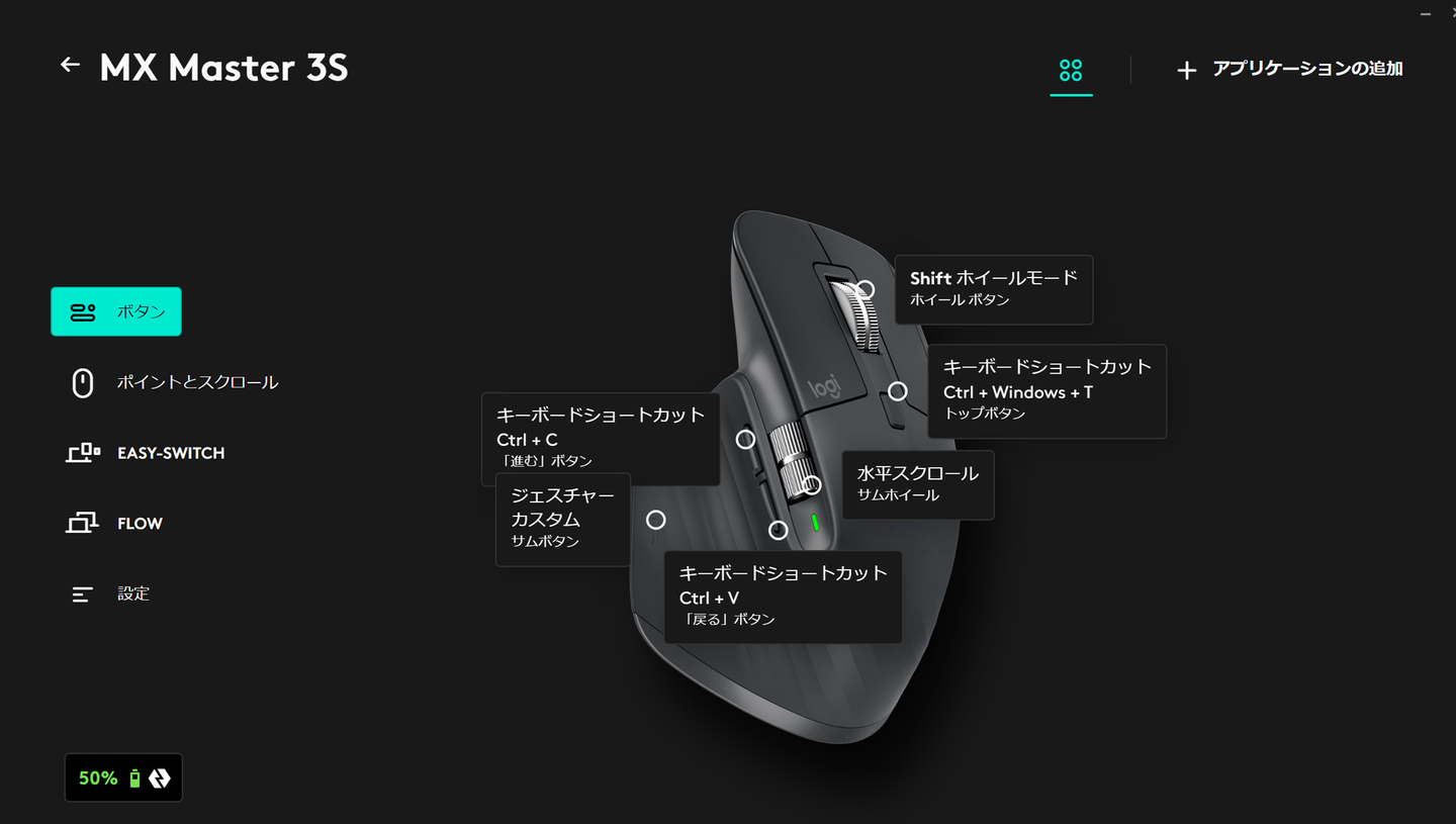 このマウスには専用のアプリケーションが用意されていて、そこでボタン設定やポイントの感度、スクロールの早さなど、細かくカスタマイズすることができます。