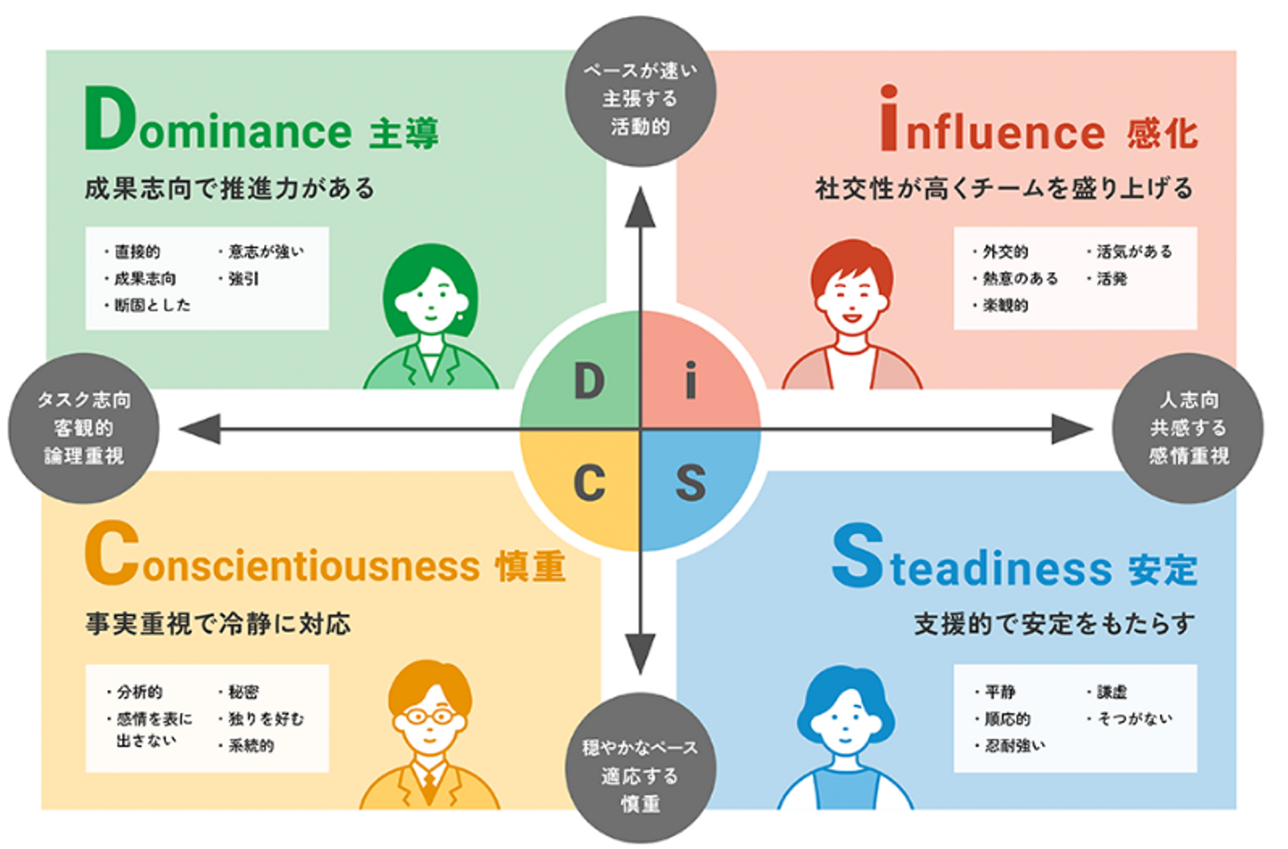 DiSCは、人の行動スタイルを**「主導(D)」「感化(i)」「安定(S)」「慎重(C)」の4つのタイプに分類し、それぞれの特性を科学的に理解するためのツールです 。世界中で活用されている信頼性の高いアセスメントツールです 。