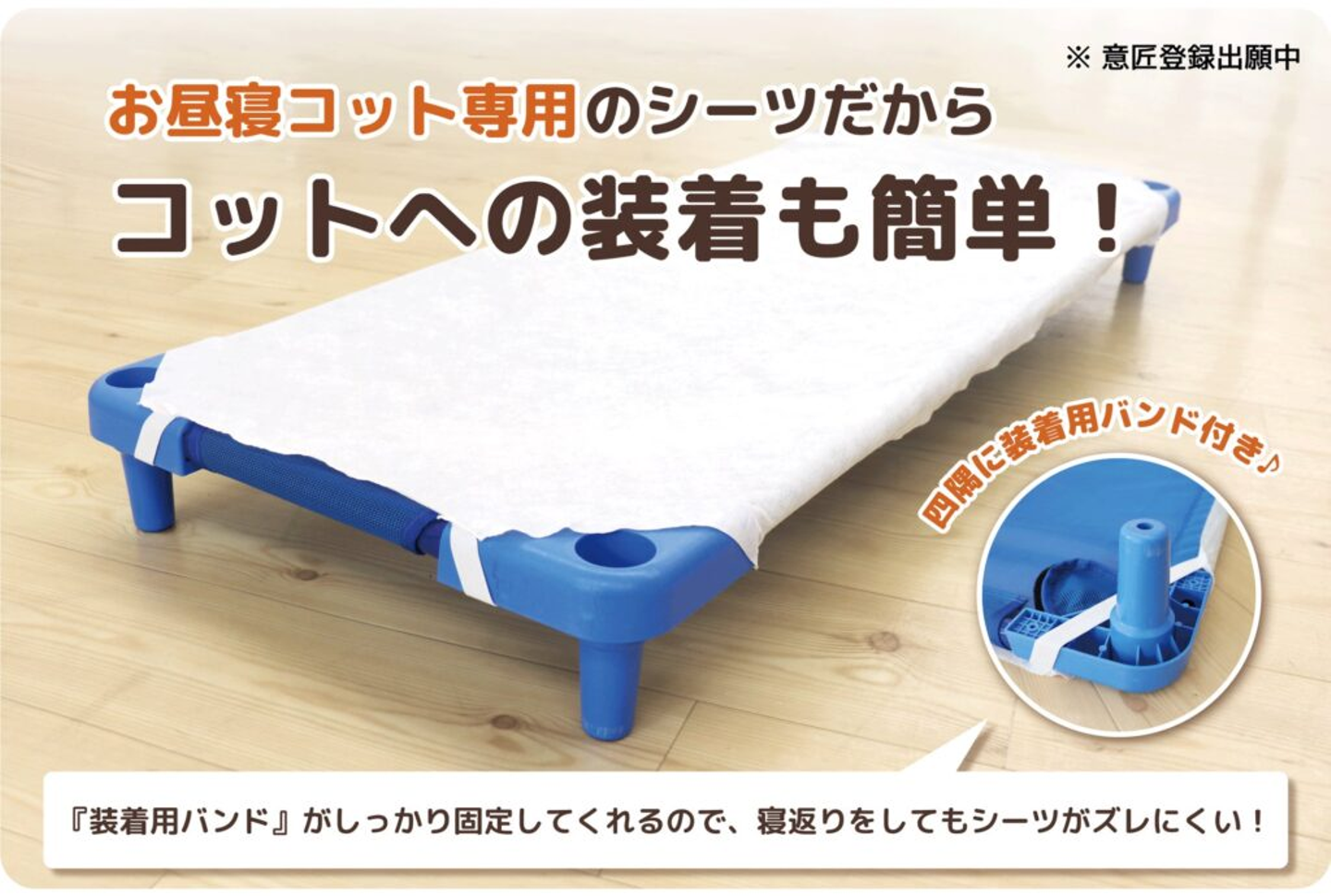 子どもたちが安心してぐっすりお昼寝できるように、保育施設にヒアリングを行いながら繊維商社と協働し、独自に開発しました。(現在、意匠登録出願中)